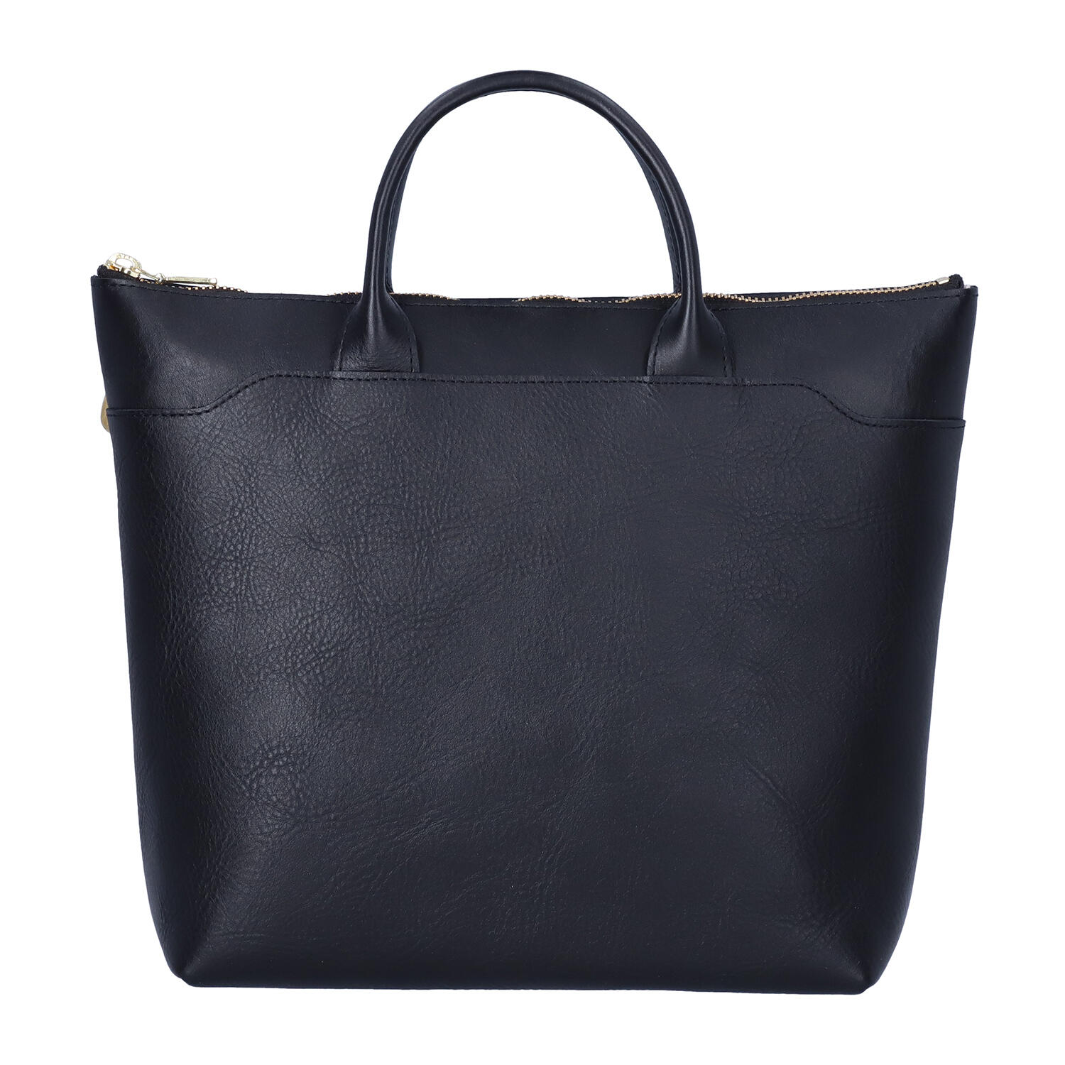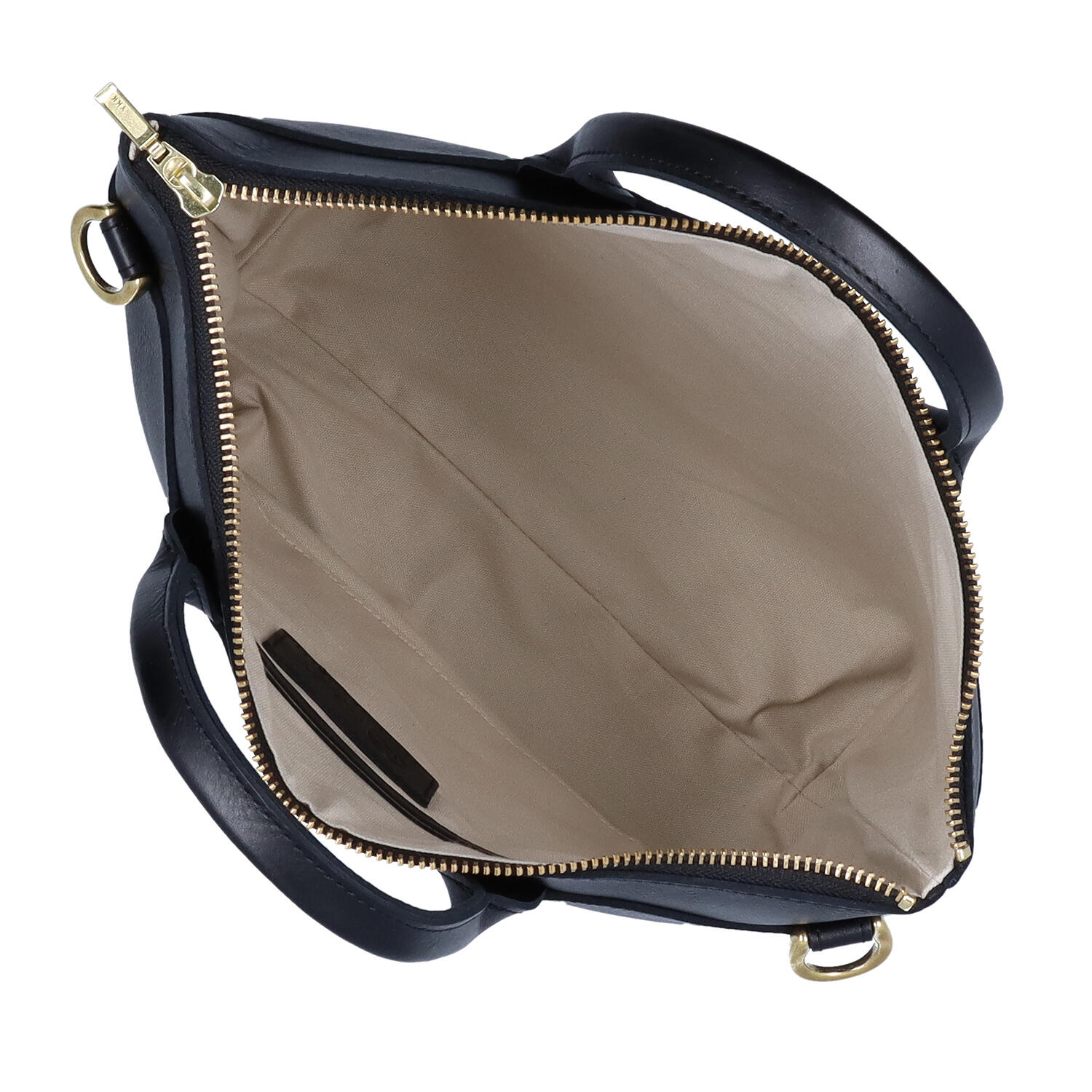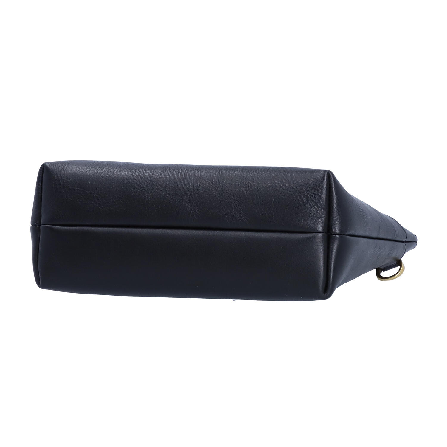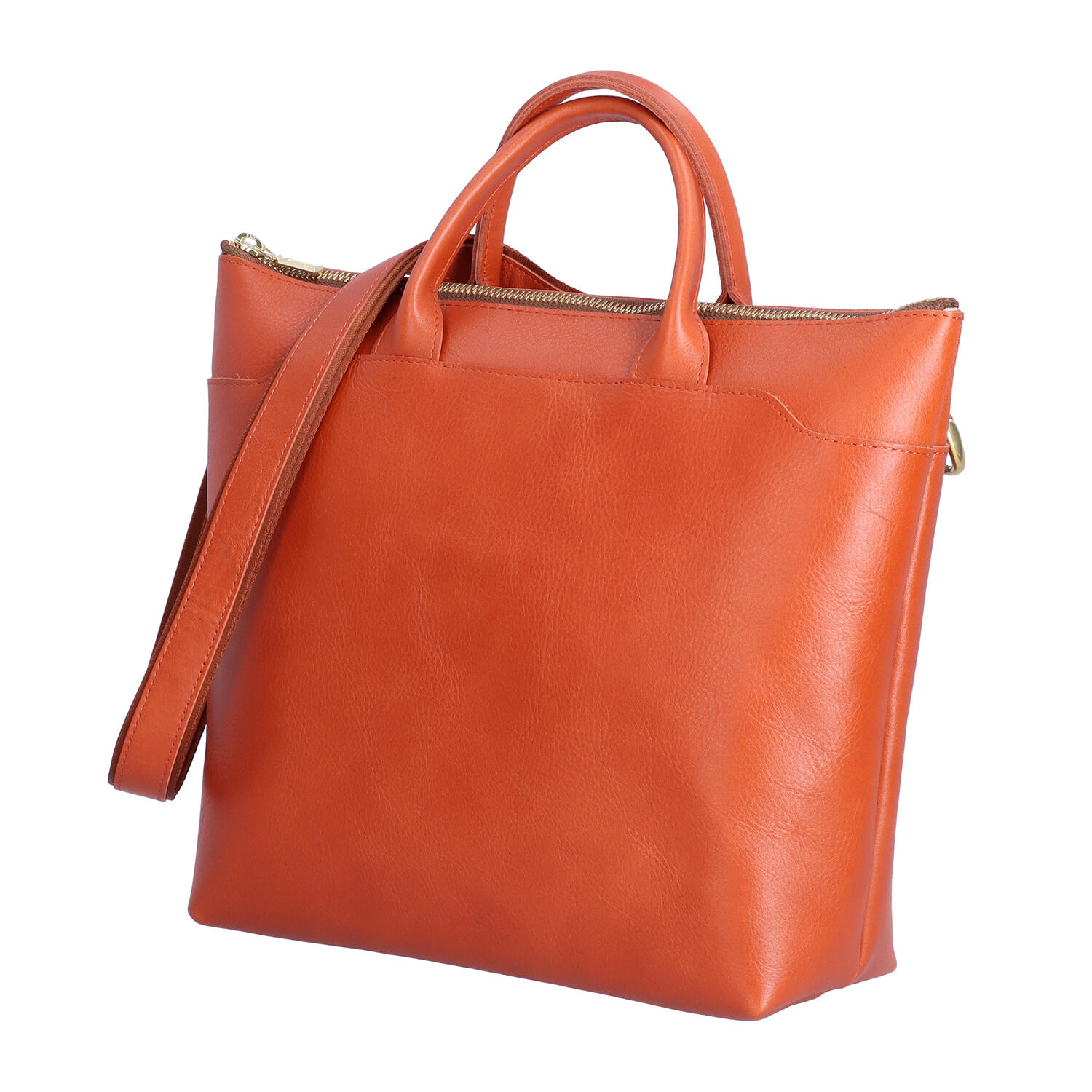 着脱式のショルダーストラップの有無で、印象を大きく変えることができる2Wayタイプのトートバッグ。開口部はファスナー付きで、安心感があります。マチが台形のシルエットを作るため、斜めがけなどにした時も体に無理なくフィットします。牛革の程よい光沢が、シンプルなデザインに立体感を持たせています。