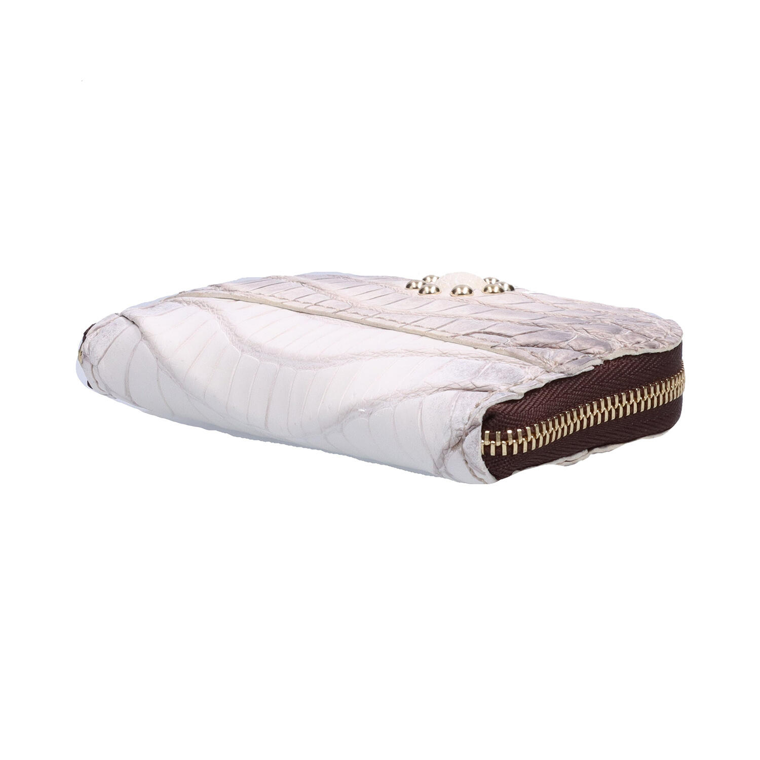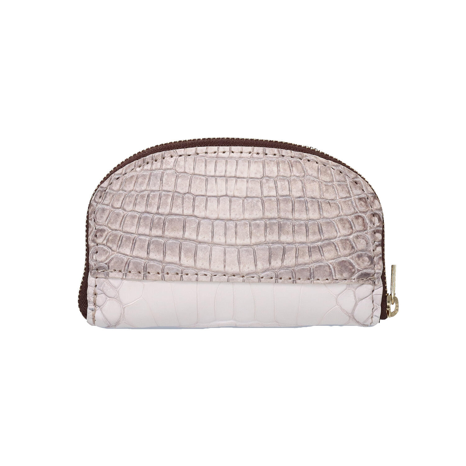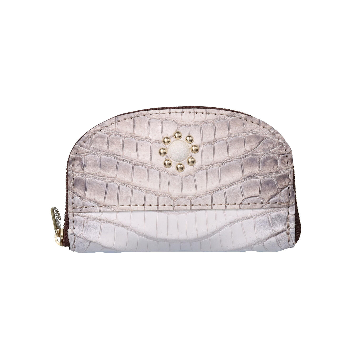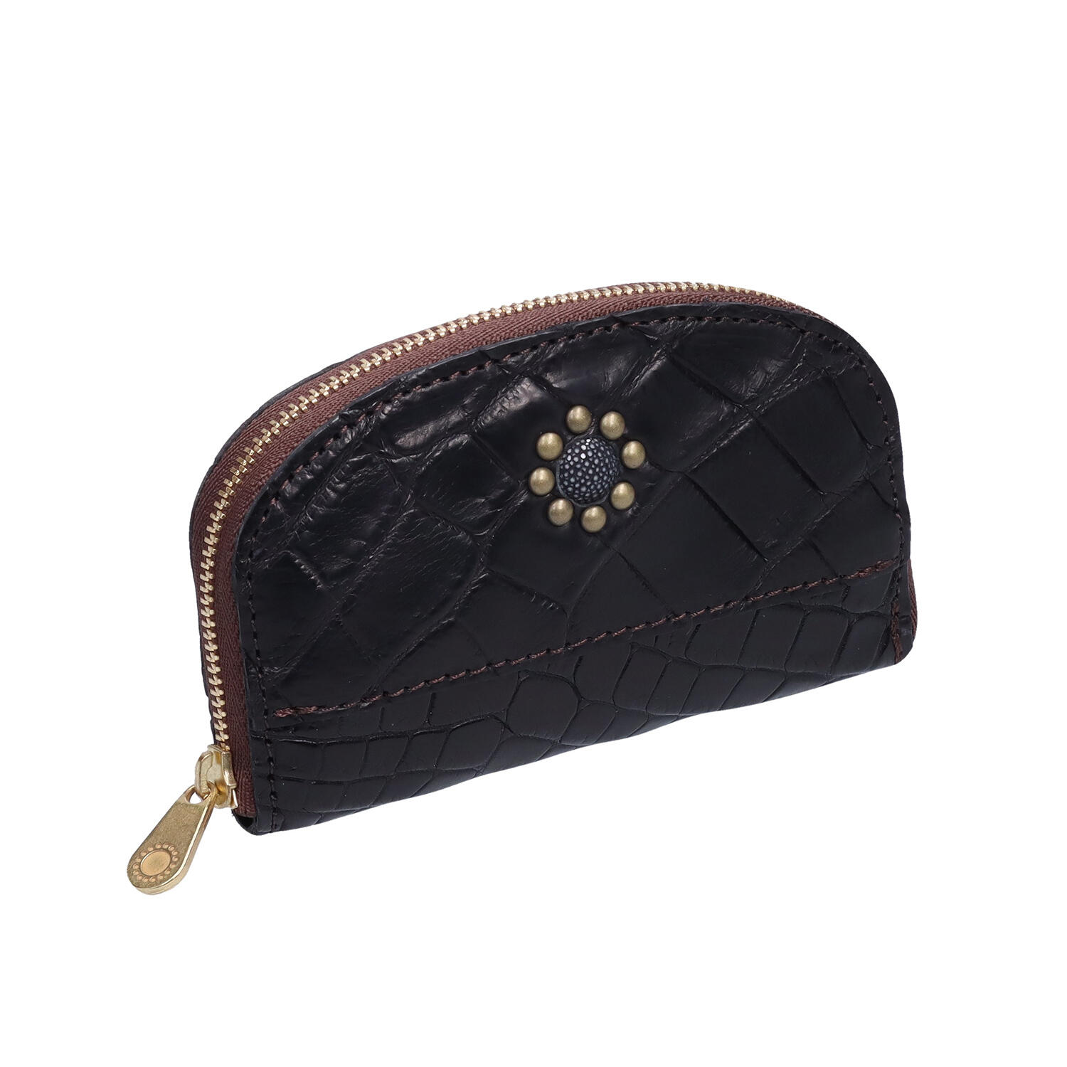 財布の機能を備えたキーケース。紙幣は4つ折り、コインは1列に並べて収納するコンパクトタイプです。クロコダイルに「ガルーシャ(エイ革)」のワンポイントと真鍮のドットをあしらい、小さなアイテムに、素材の個性と機能、遊び心を表現しました。スマートフォンと重ねても持ちやすい大きさのコンパクトウォレット。性別を問わずお選びいただけるデザインです。