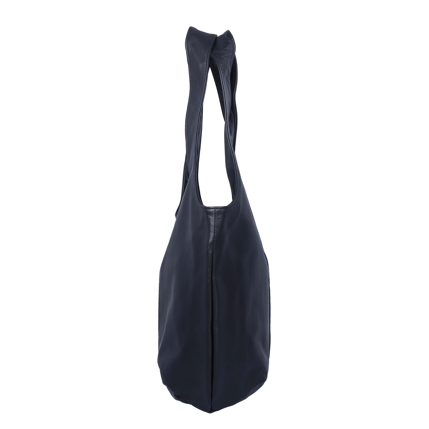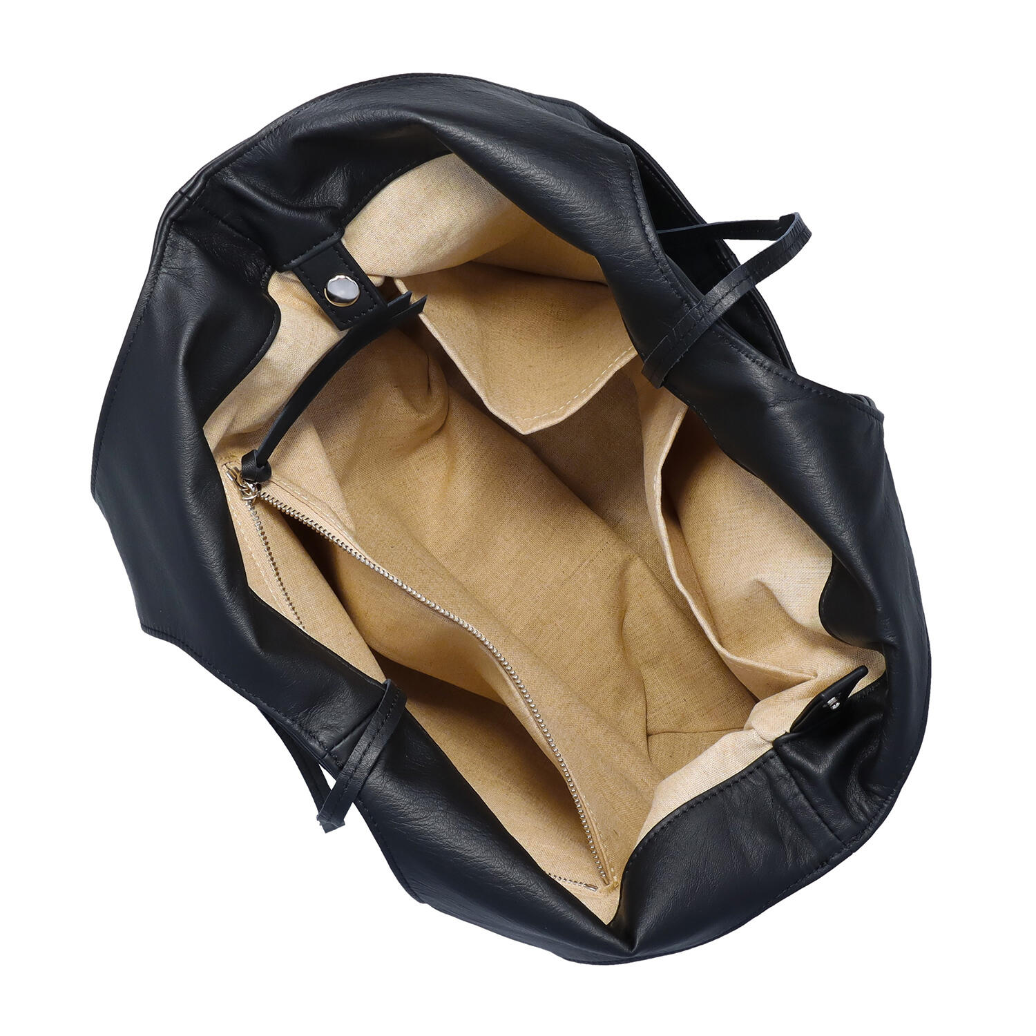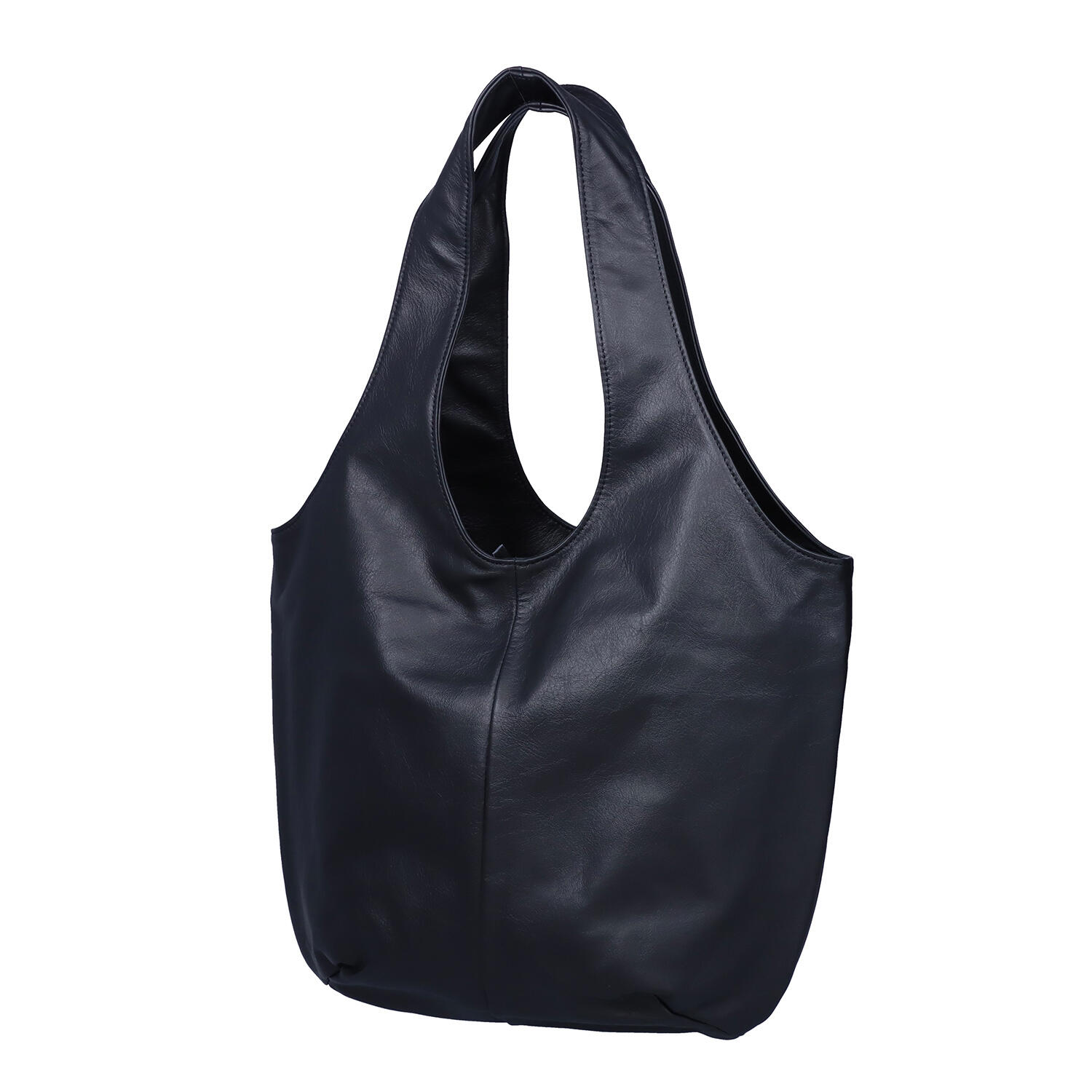 シンプルな黒でも、丸みのある形が優しい印象の牛革バッグ。表面に特殊なオイルと染料による加工を施しており、水が染み込みにくく、汚れも付きにくいのが特長です。細いテープで開口部の開きを調整、スナップボタンでより丸く、少し小振りに形を変えることが可能です。内側にはフリーポケットとファスナー付きポケットがあり、小さな小物も整理して入れることができます。