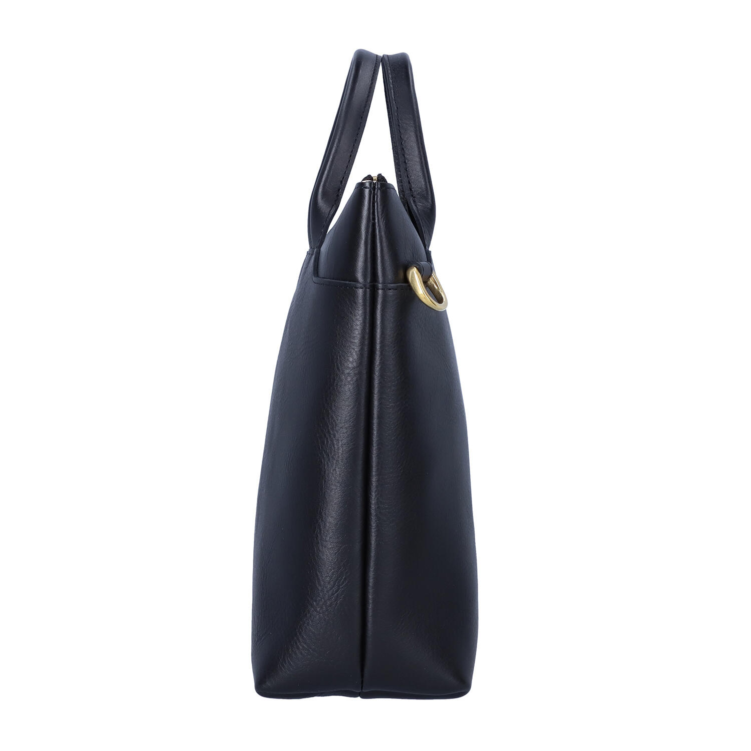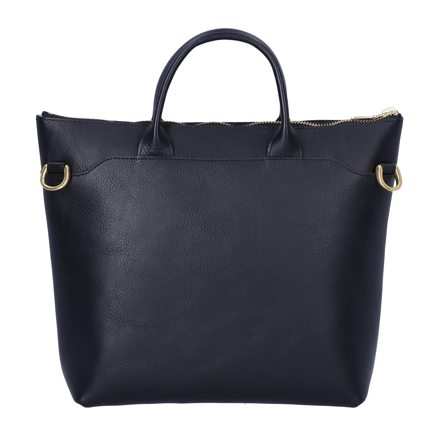 着脱式のショルダーストラップの有無で、印象を大きく変えることができる2Wayタイプのトートバッグ。開口部はファスナー付きで、安心感があります。マチが台形のシルエットを作るため、斜めがけなどにした時も体に無理なくフィットします。牛革の程よい光沢が、シンプルなデザインに立体感を持たせています。