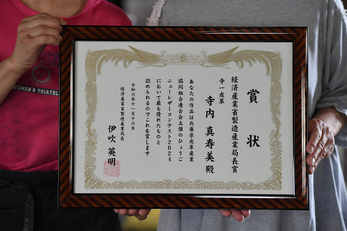 兵庫県内のタンナーが部門ごとに新作の革を発表する「ひょうごニューレザーコンテスト2024」にて、経済産業省製造産業局長賞を受賞した寺一皮革。姉妹で寺一皮革を運営する妹の井料加保里さん(以下、井料さん)と、姉で代表の寺内真寿美さん(以下、寺内さん)に、受賞作「テラーナ2000」の話を中心に語っていただいた。