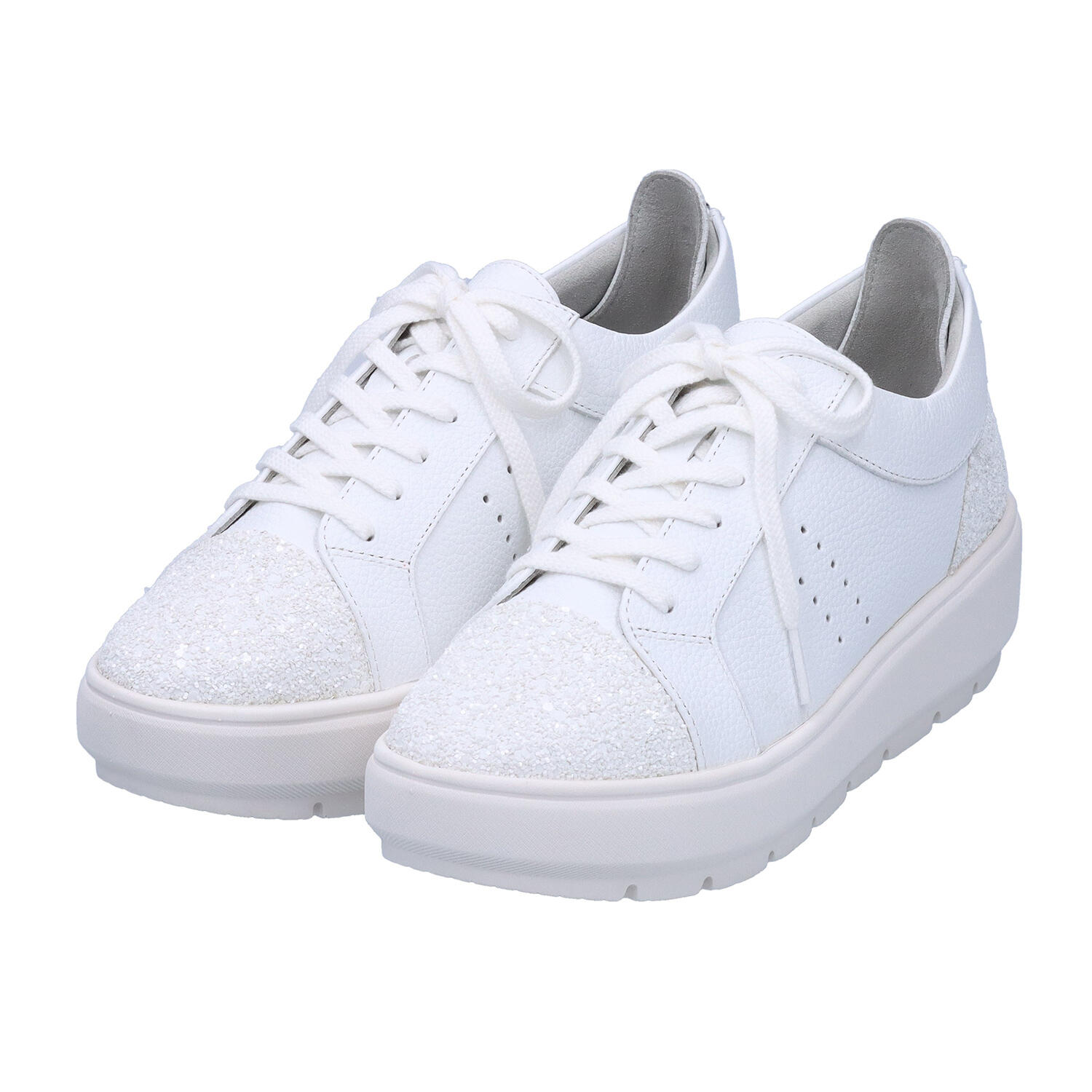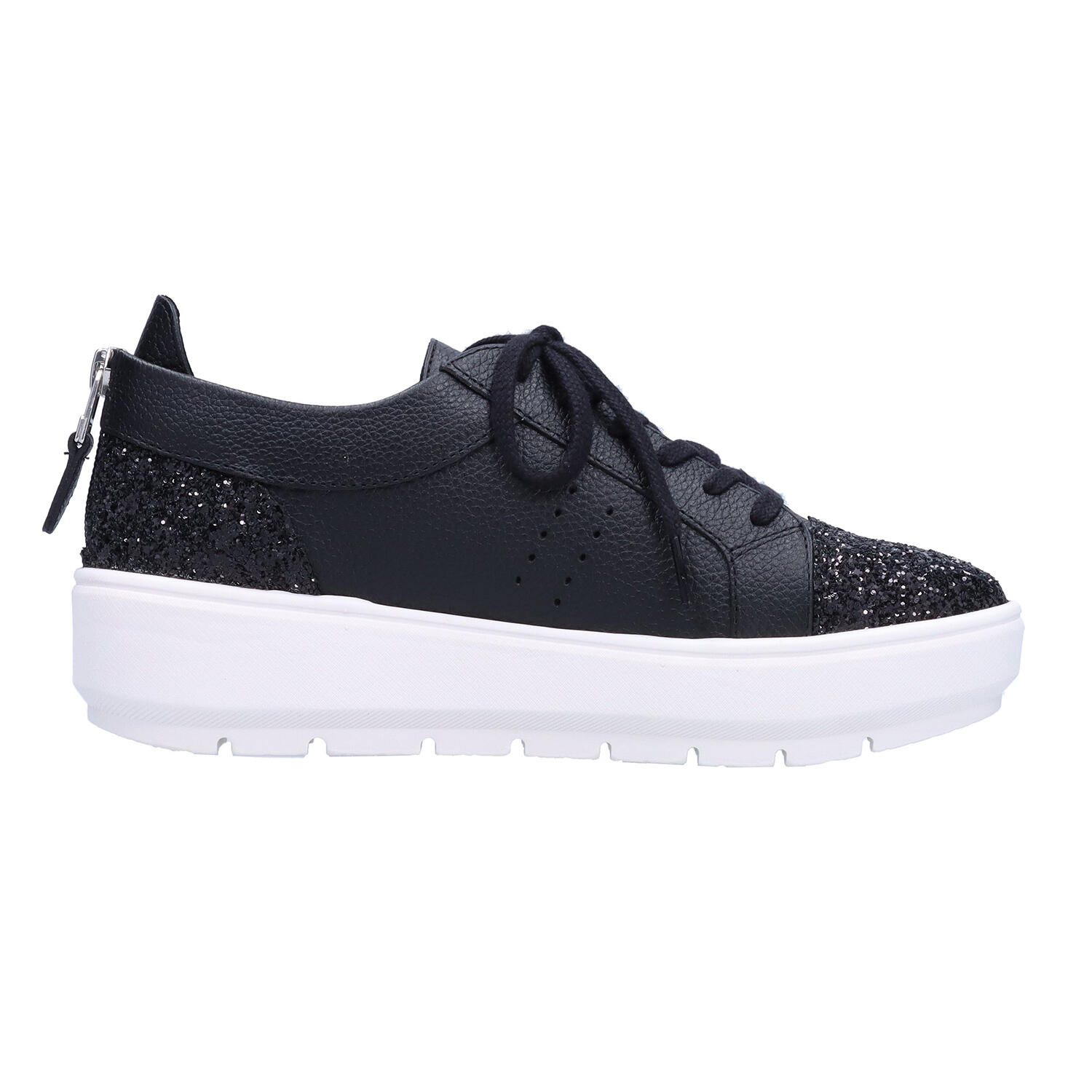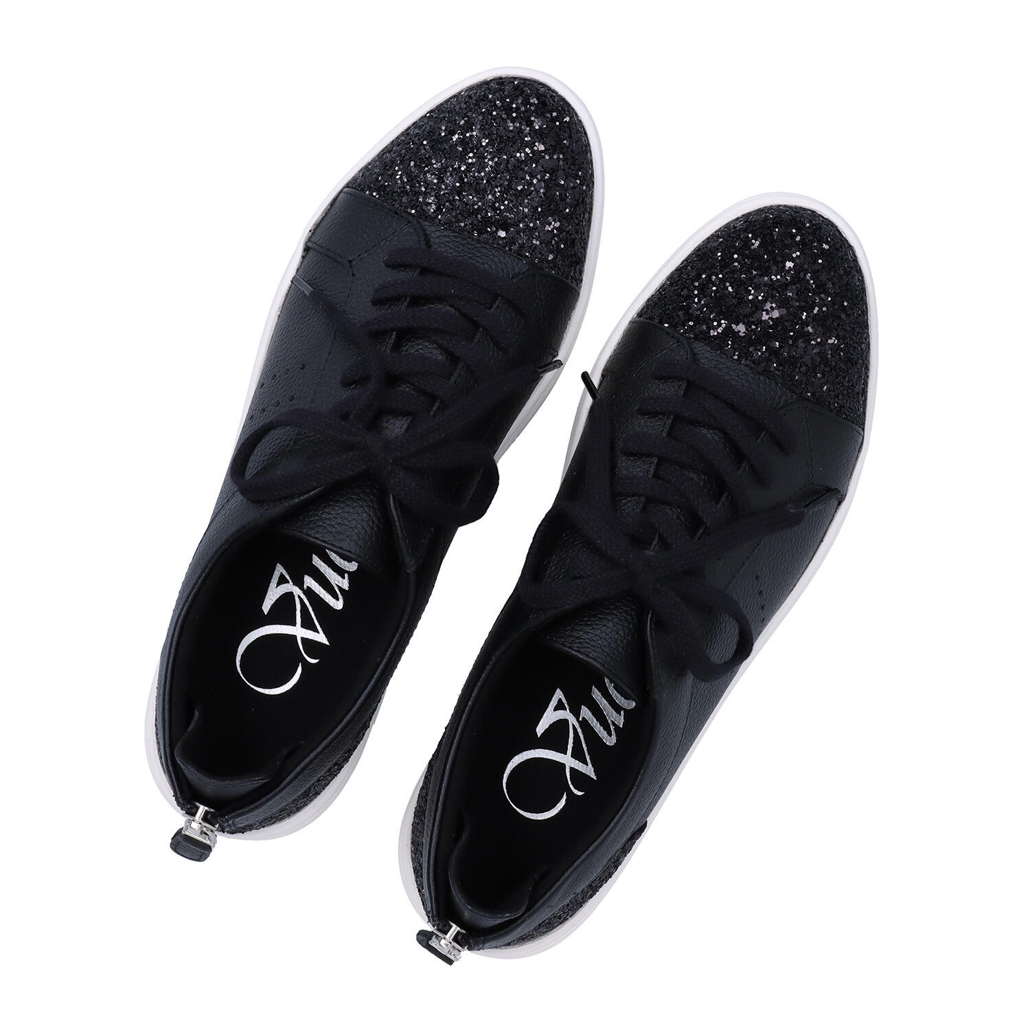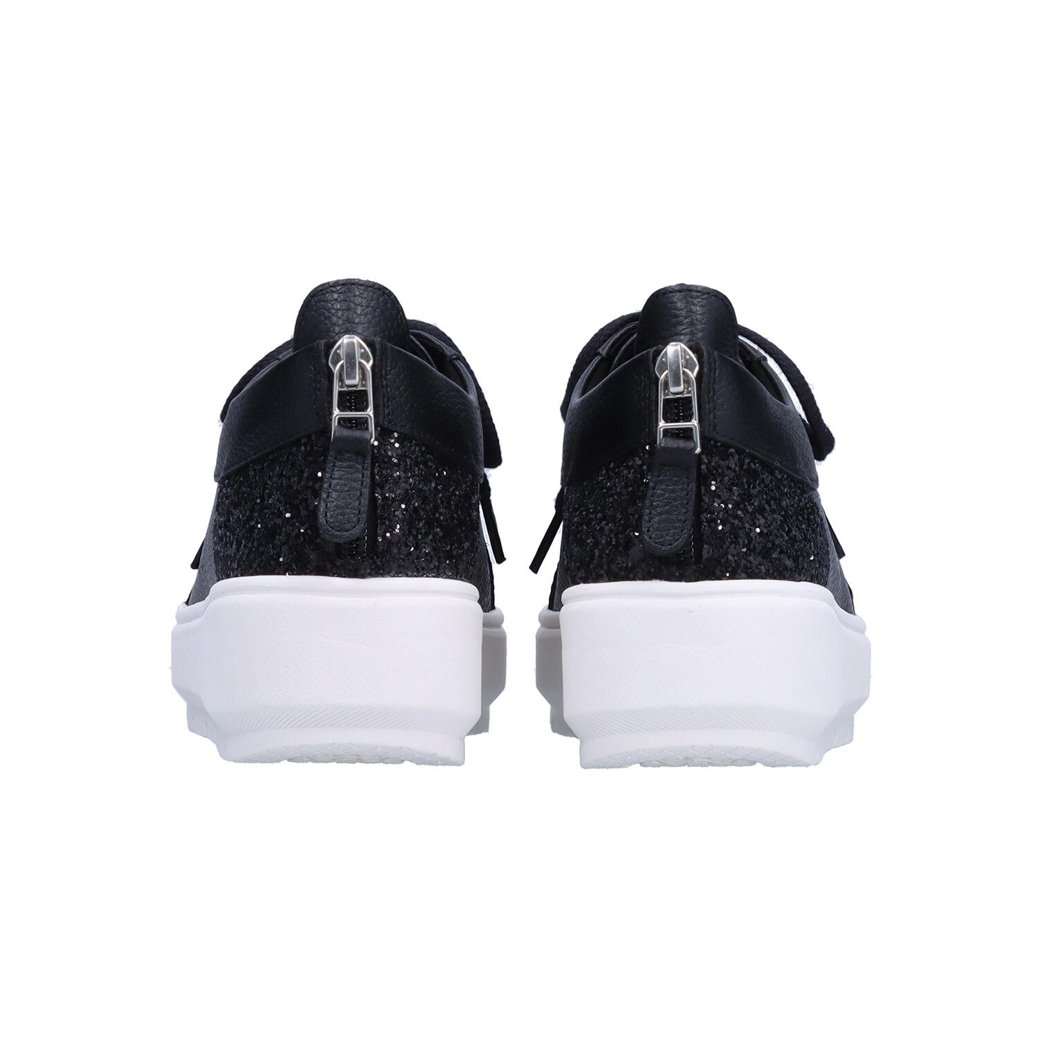 爪先と踵部分にグリッターをあしらった、きらっと光るレザースニーカー。フィット感を調整できるレースアップタイプですが、踵のファスナーで着脱も簡単です。軽くてクッション性も高いEVA素材をアウトソールに使用。表情はスニーカーですがヒール高は5㎝。1.5㎝の傾斜があり、足長効果も得られます。