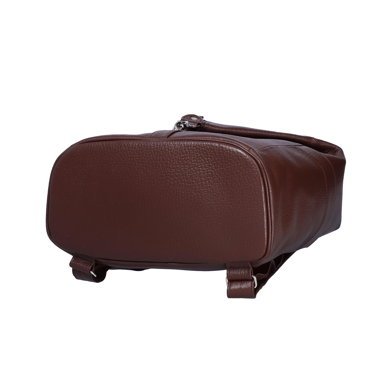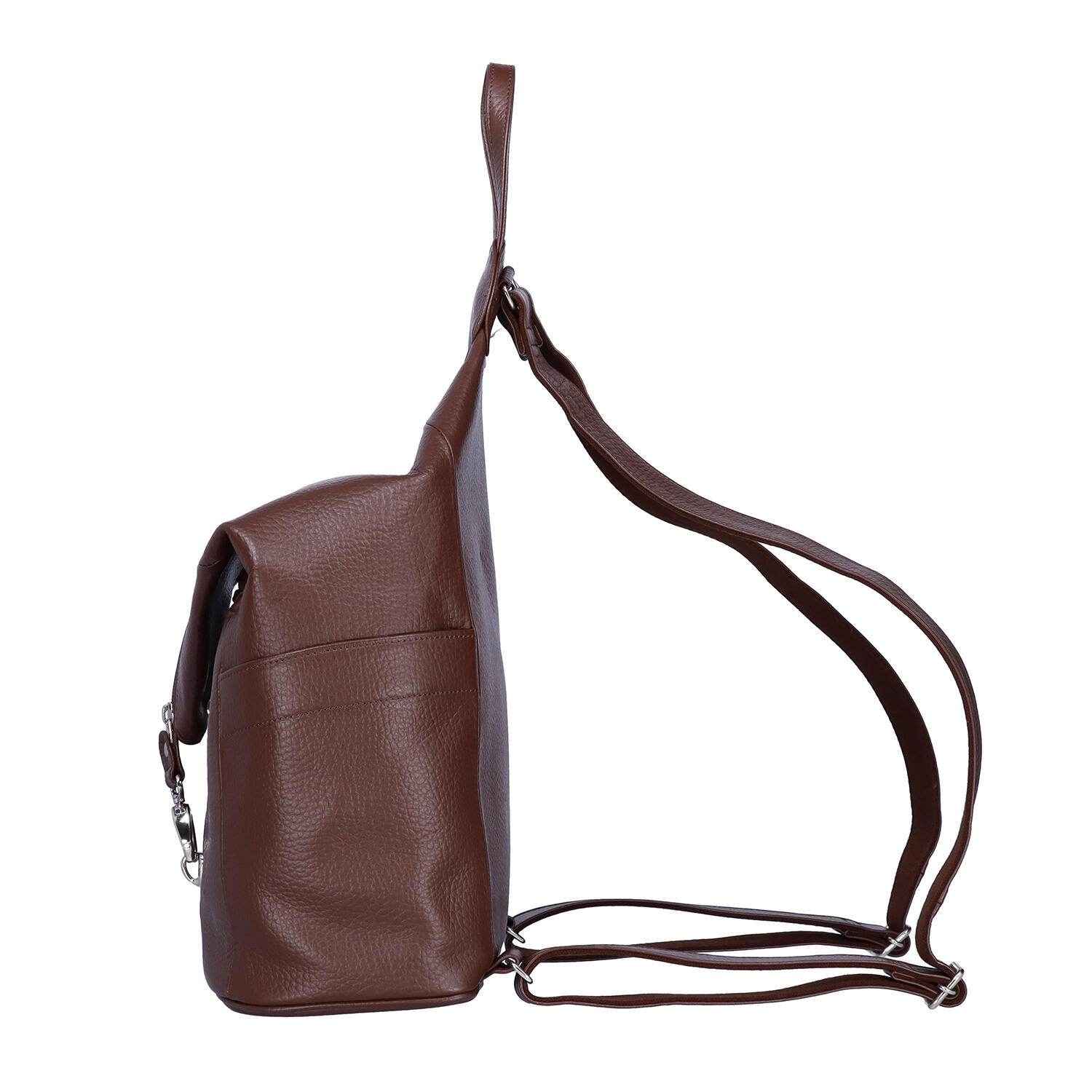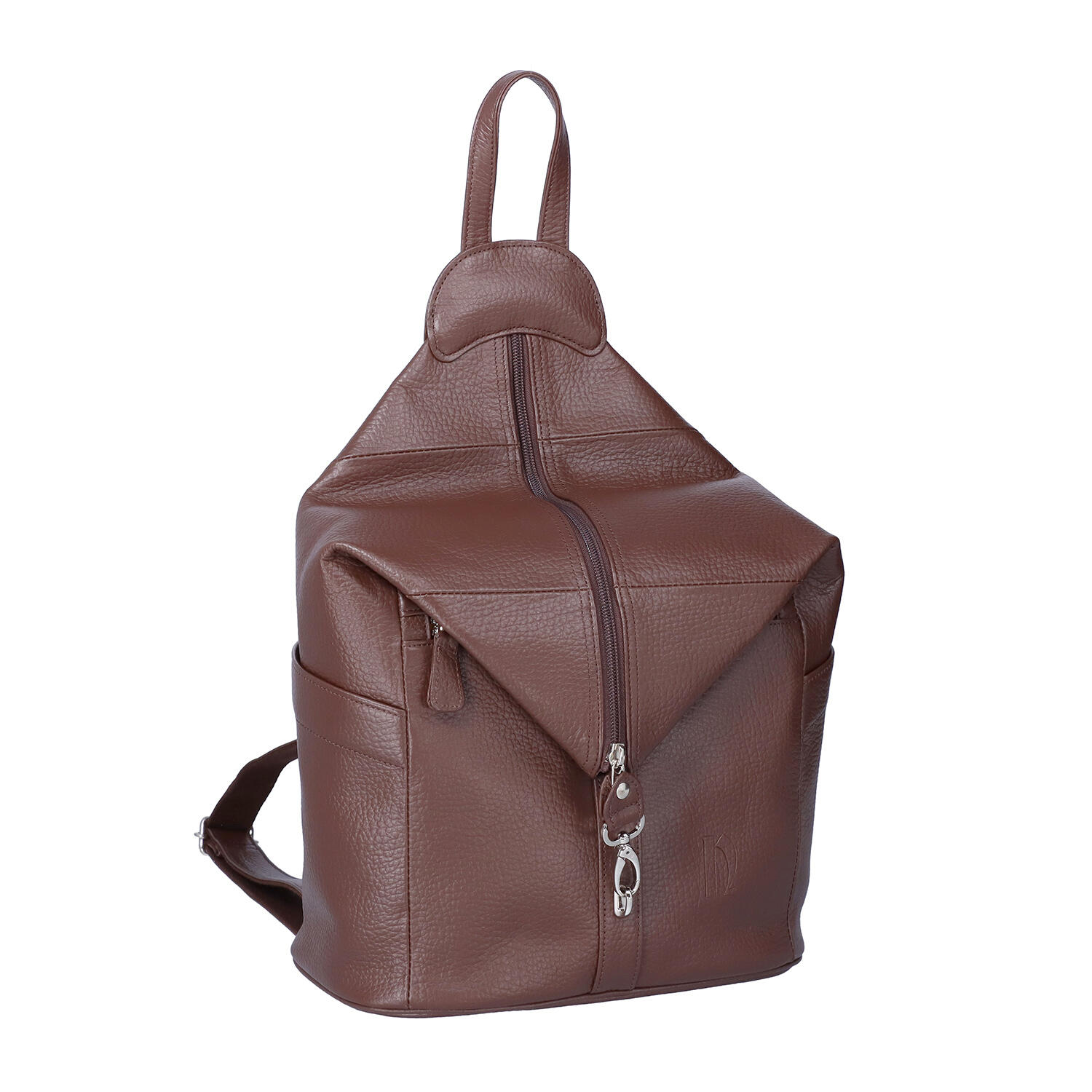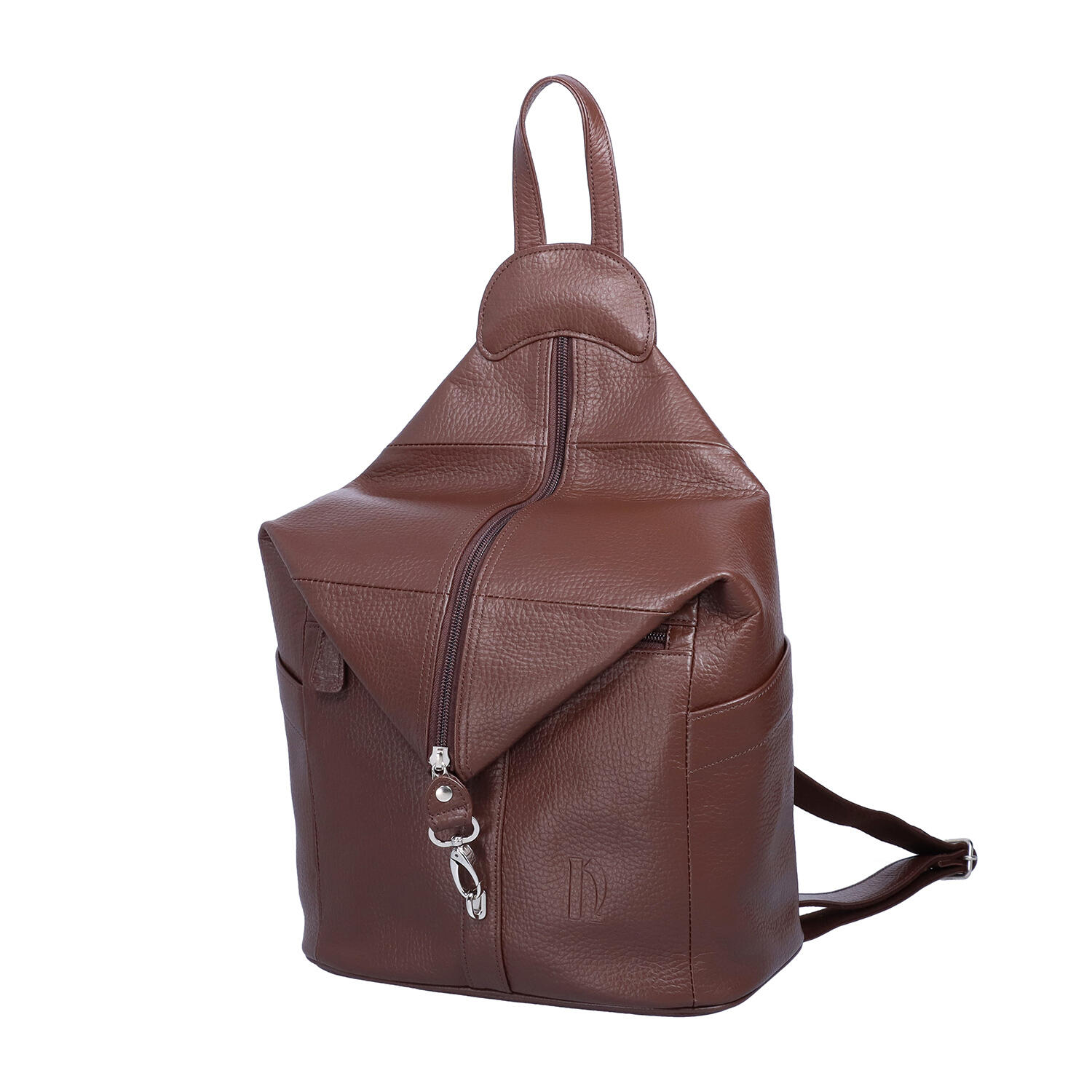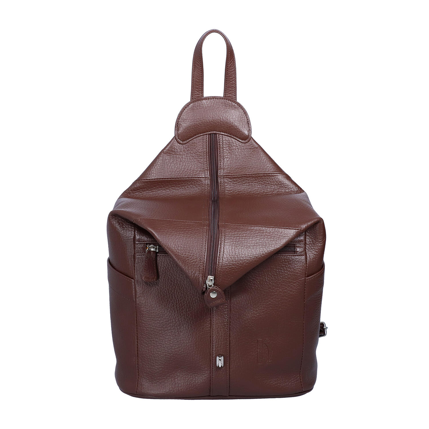 後ろ姿で視線を集める、個性的なシルエットのリュックサック。発色のよい型押しの牛革を使い、内装にも明るい色の裏地をあしらって視認性を高めました。ショルダーストラップは自由に長さを変えることができ、体に当たる面はすべりにくい仕上げ。中央部分から下に伸びており、ずり落ちにくいデザインです。金具の位置をずらして形を変えると、更に容量を増やすことができます。
