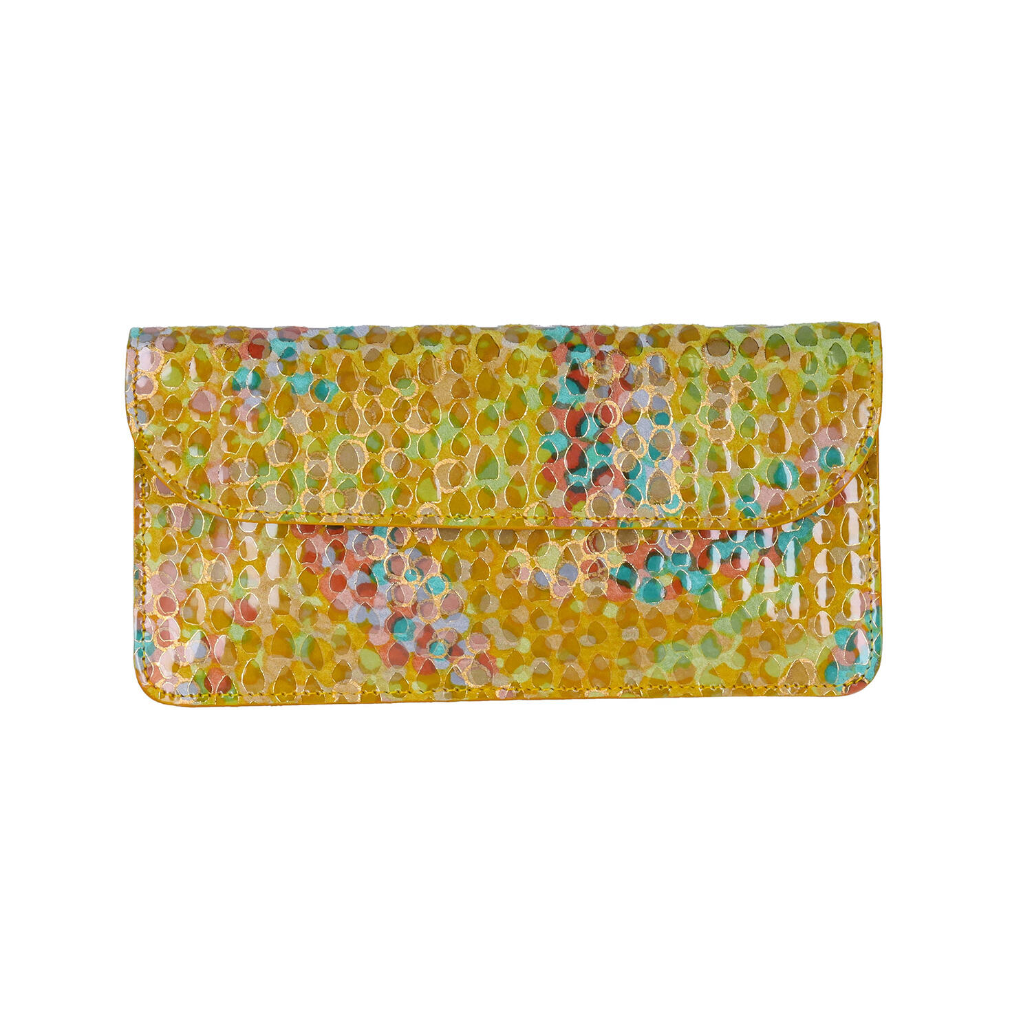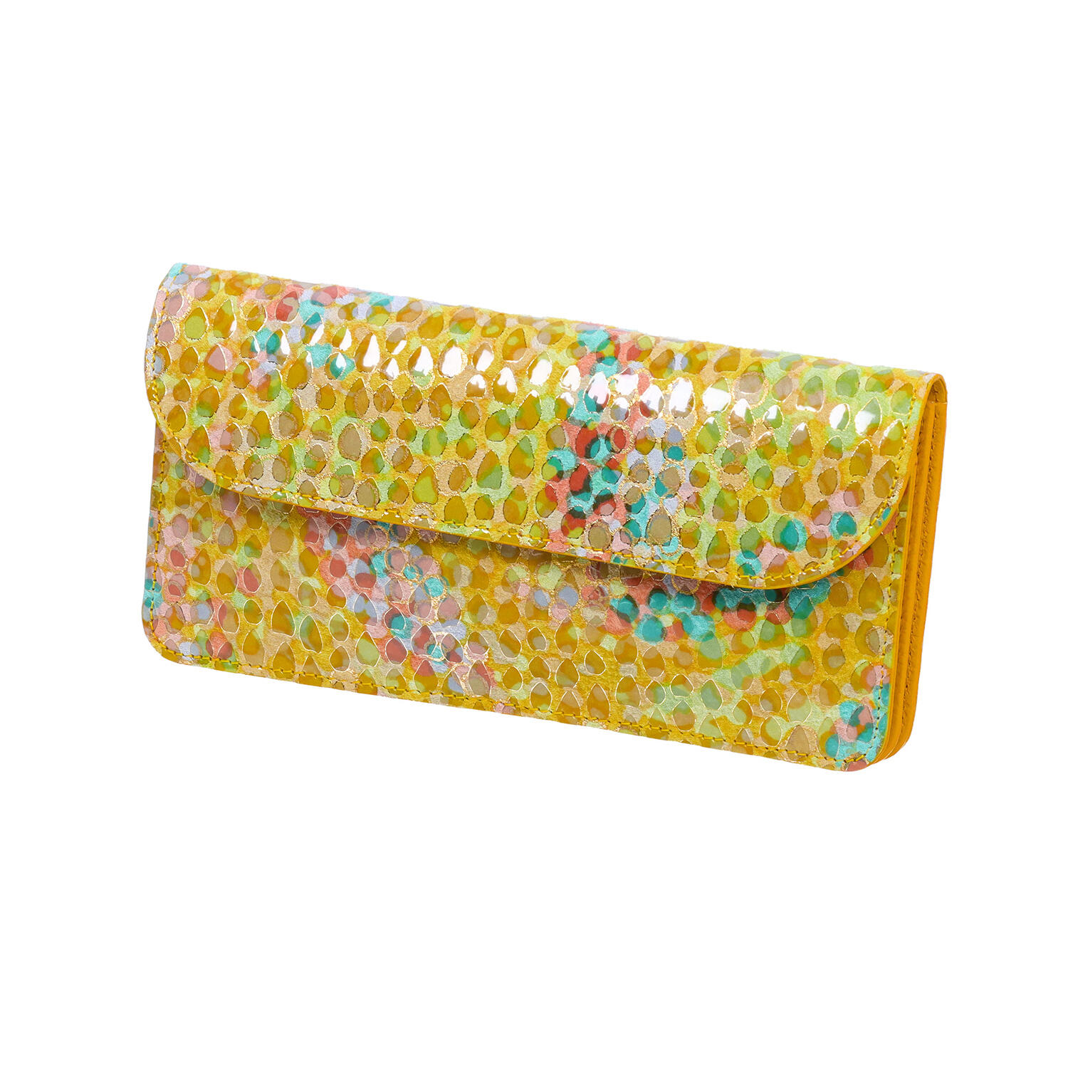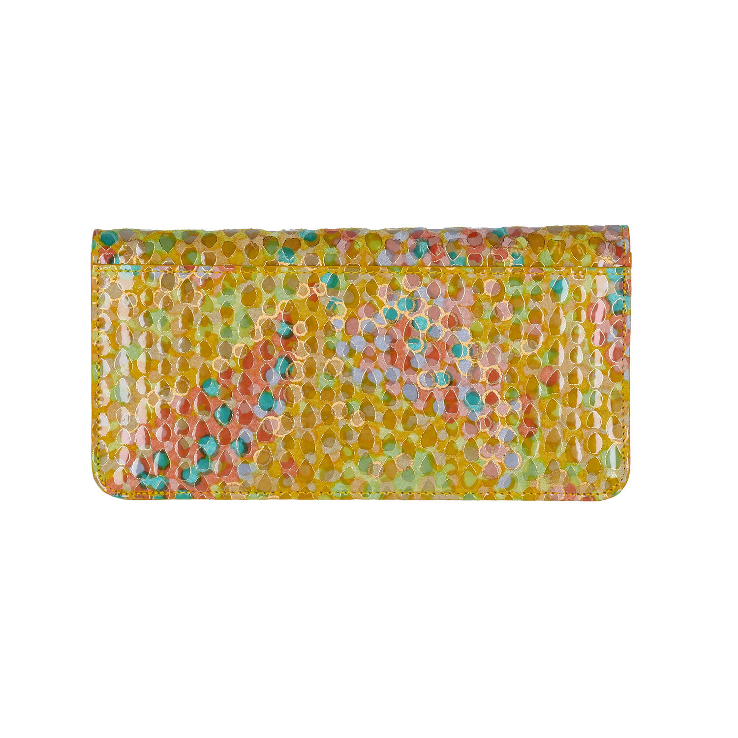 伝統工芸などでも使われる「手捺染(てなせん)」(シルクスクリーンプリントの一種)で鮮やかに染められたピッグスキン。そこに雫型のエナメル樹脂を染み込ませた素材を使いました。点描画のような美しい色柄で、手にする度に明るい気分になれる長財布です。一般的なカードの大きさより少し大きなカードポケットは、診察券などを入れるのにも適しています。フリーポケットも充実しています。