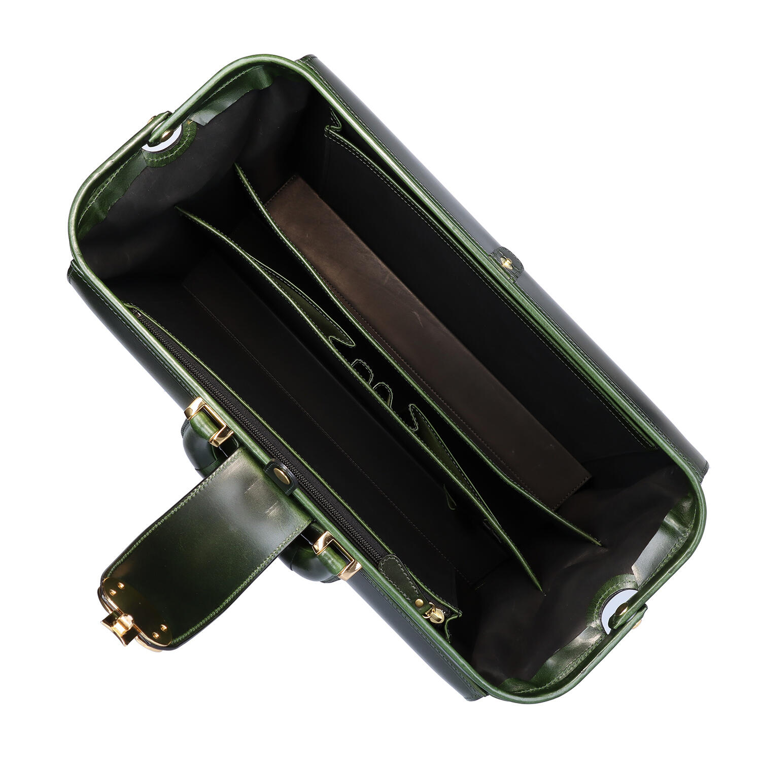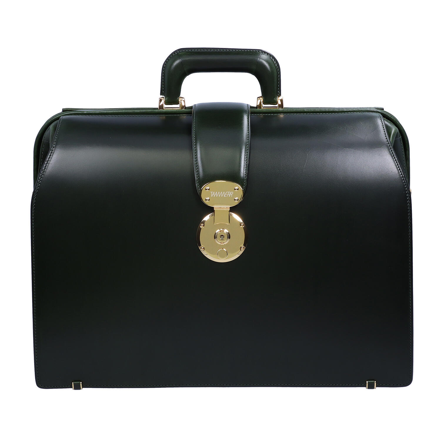 三層に仕切られた、収納力のあるダレスバッグ。ダレスバッグのアイコンのような中央の錠前は、緊張感のあるデザインであると共に、精密機械や貴重品を持ち歩くための歴史あるバッグとしての表情を現代にも伝えます。植物タンニン液で満たしたピット槽に皮を約1ヵ月漬け、時間をかけて作られた牛ヌメ革を使用。さらに革にワックスを浸透させているので、堅牢度があり、エイジング経年変化をじっくりと楽しめます。ふっくらとしたハンドルとベルト部分に技術に後押しされた美しさが宿ります。