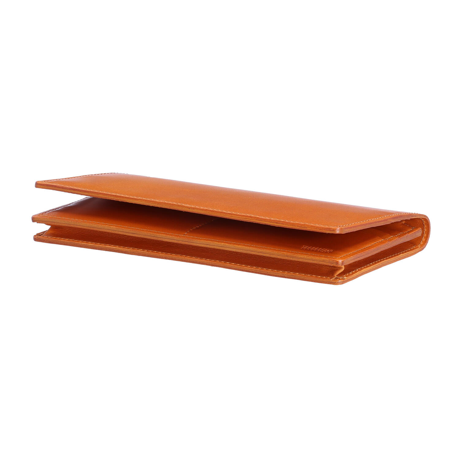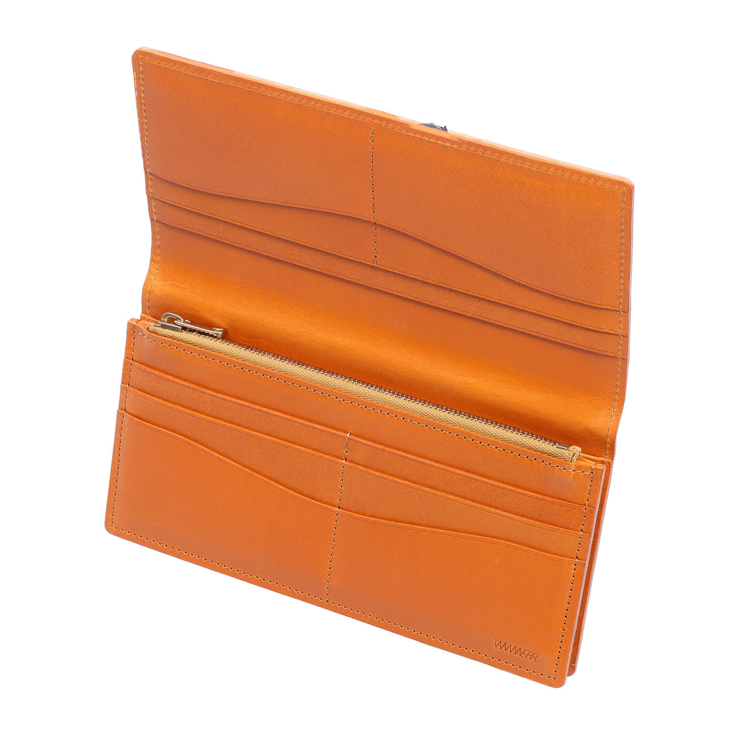 マチが箱型になる「通しマチ」製法を採用し、厚みが出ても型崩れしにくく、紙幣、領収書などが整理しやすい容量の長財布。 肌理(きめ)の細かいキップレザー(仔牛革)に、ピット槽での植物タンニンなめしを施して、さらに素材の魅力を引き出しました。内装も全て同革で仕上げ、エイジングを楽しみにして毎日手にする事に喜びが感じられるような長財布です。カードポケットは10段です。