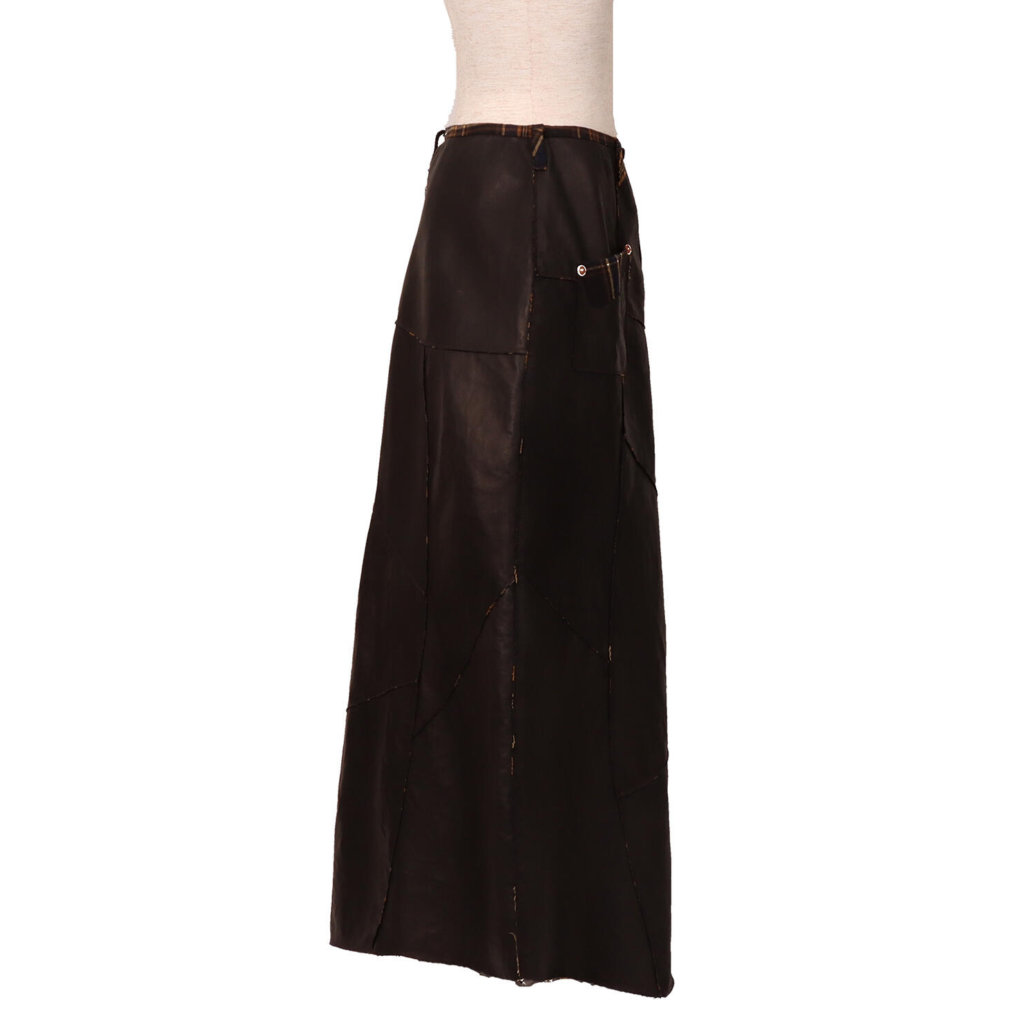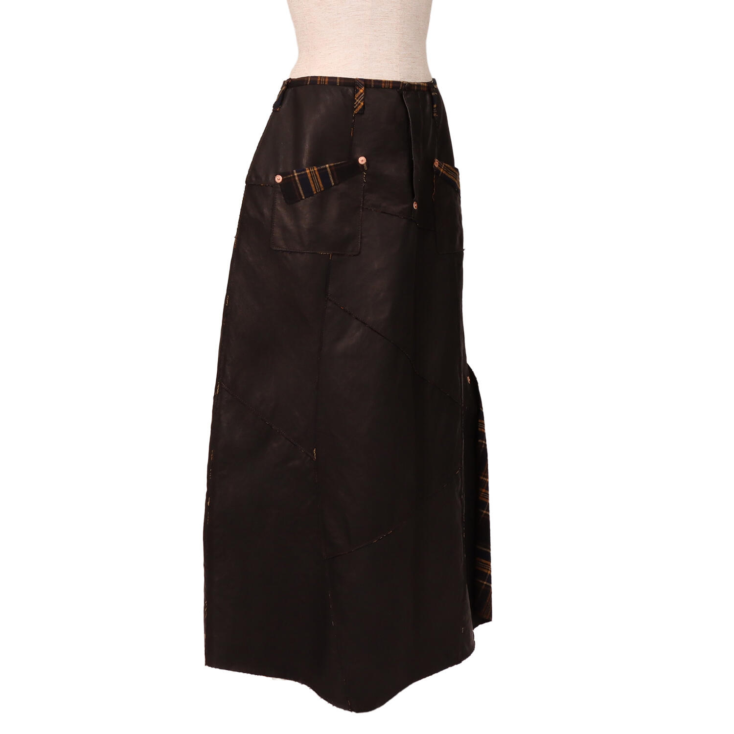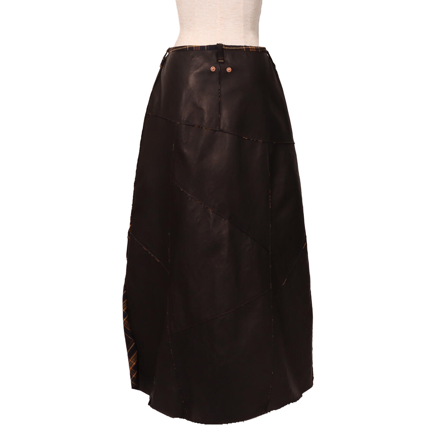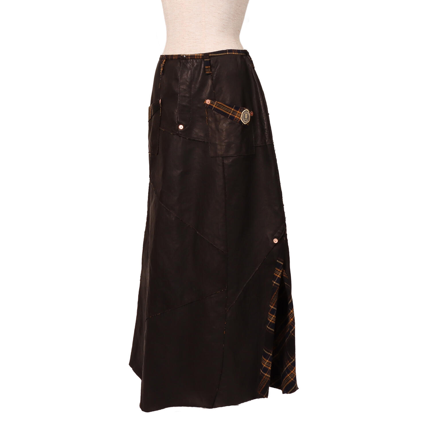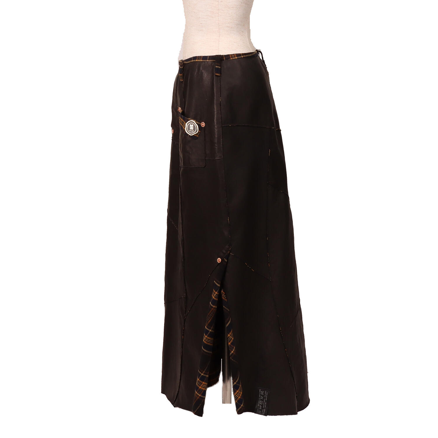 0.3㎜の薄さに漉いた鹿革にネルシャツのような風合いのコットンを張り合わせたボンディング素材。パッチワークとリベットで、ワークウェアテイストに仕上げたレザーのスカートです。製品にした後に洗いをかけ、素材の動きを引き出しました。チェック柄がのぞく深めのスリットは、パンツとのレイヤードも軽やかに見せます。パッチポケット付き。セットアップで着ることができるベストもあります。3サイズをご用意しています。