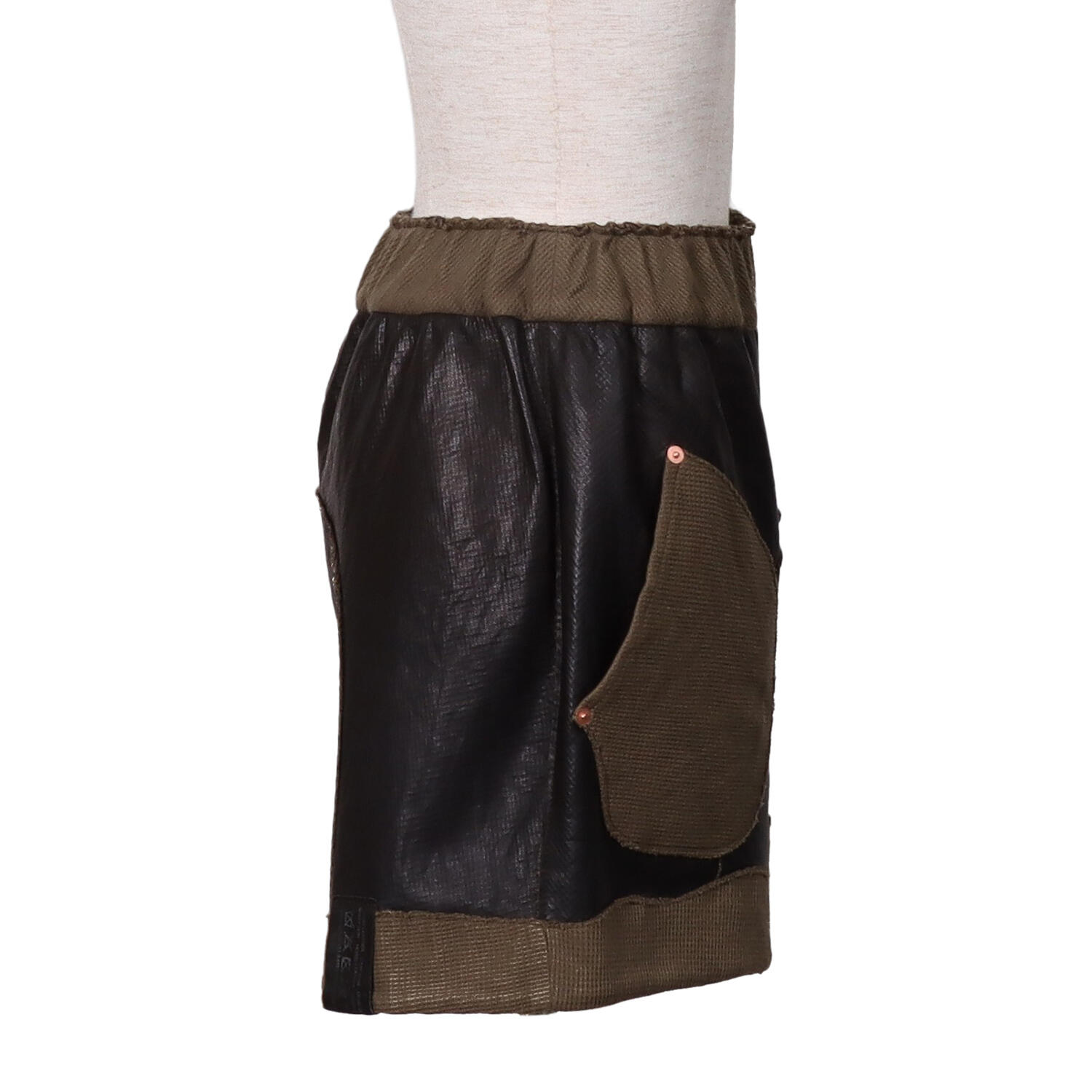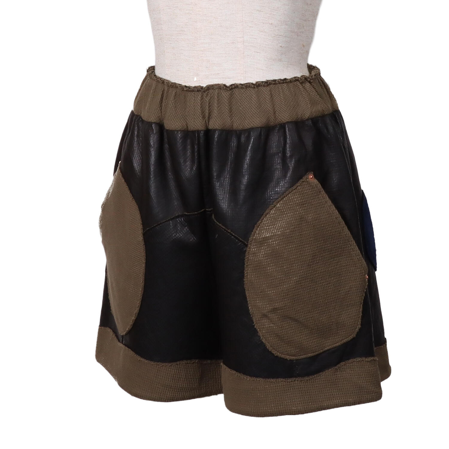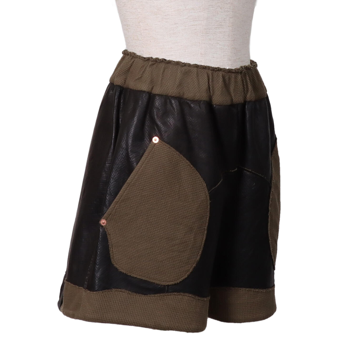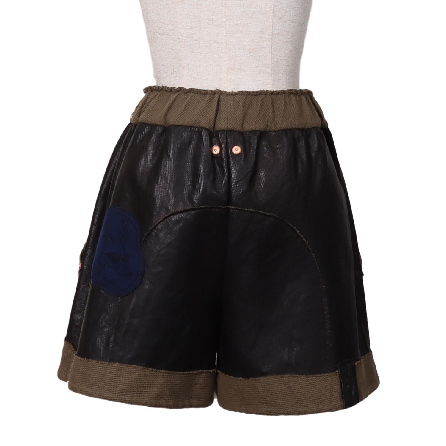 極薄の鹿革にワッフル地を合わせたボンディング生地。さらに、銅のリヴェットでミリタリーエッセンスをプラスしたショートパンツです。製品に仕立てた後に水洗いをして、ラフなエッジとシワ感を引き出しています。ワッフル地の凹凸が鹿革に立体感を出しているのもこの素材の注目すべきところ。ヒップの切り替えやワッペン、折り返した裾など、デザインポイントが盛りだくさんのユニークなボトムです。セットアップで着られるブルゾンもあります。