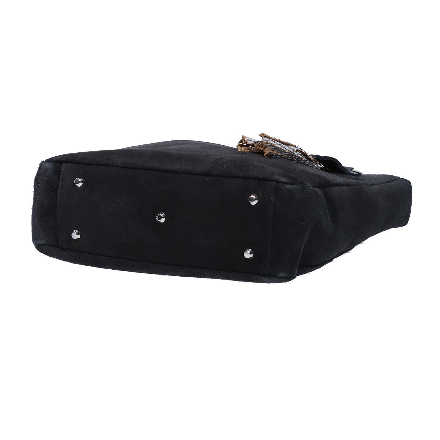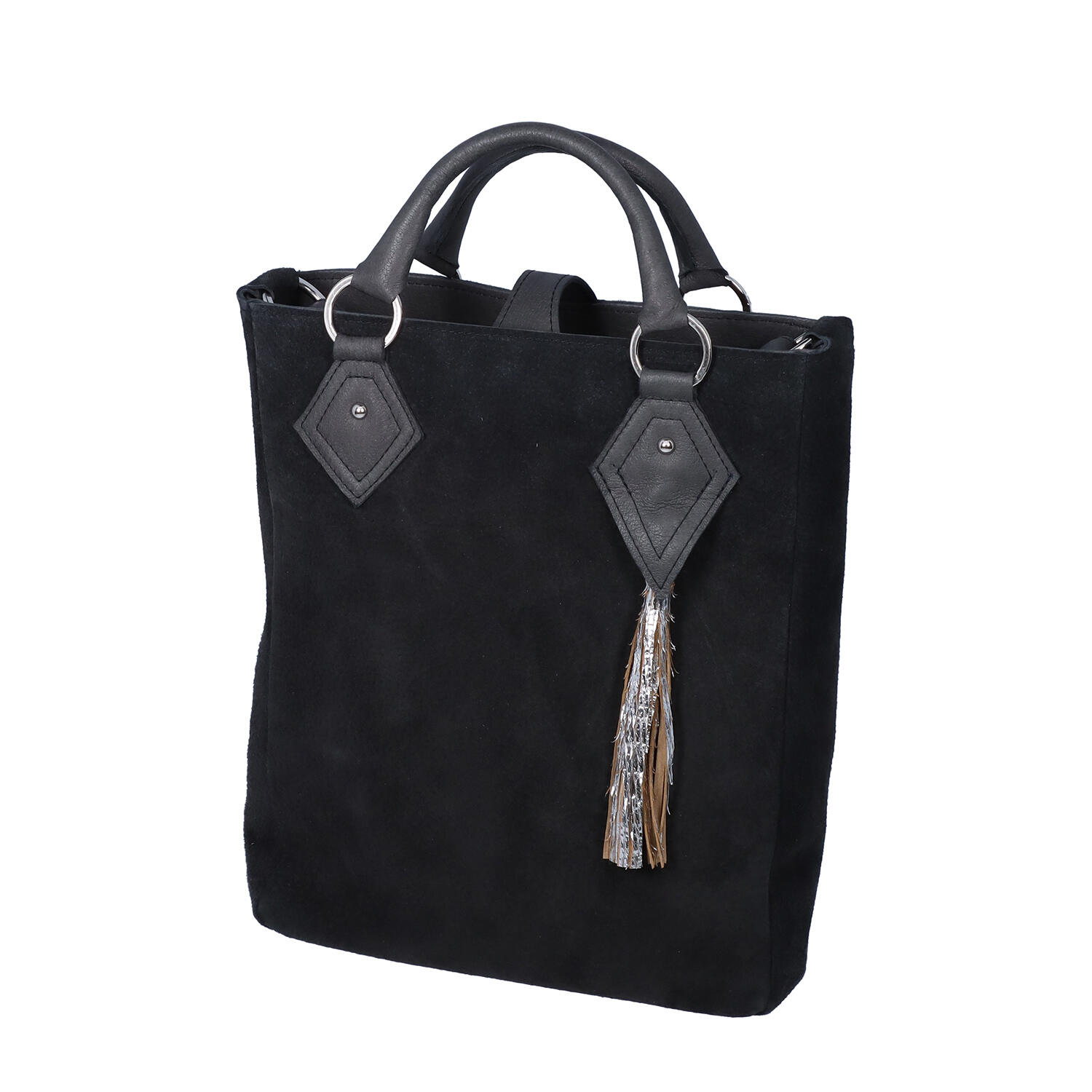 A4ファイルが入る大きさの、ショルダーストラップ付きトート。ダークカラーの縦型仕様のため、荷物が多くてもすっきり見えます。柔らかなピッグスエードと、ハンドルやその他のパーツで使われている表革とのコントラストに加え、特殊加工を施したメタリックカラーの3つの質感の違いは、手触りと経年変化が楽しみになります。アシンメトリーなダイヤ型パーツの下のタッセルは、着脱が可能。きらきらと光るショルダーストラップと共に、トートバッグの印象を大きく変えることができます。5つの底鋲が汚れと型崩れを防ぎます。