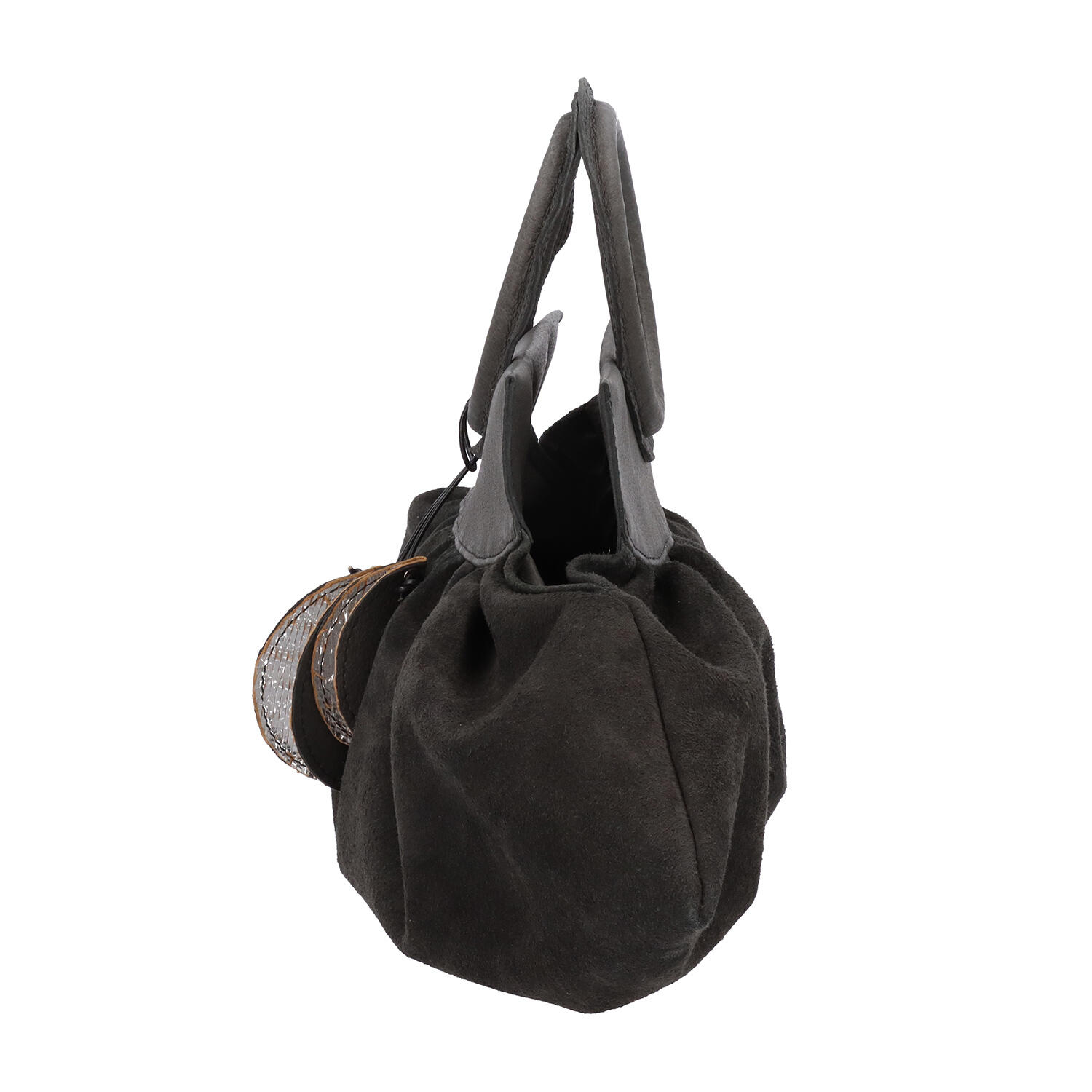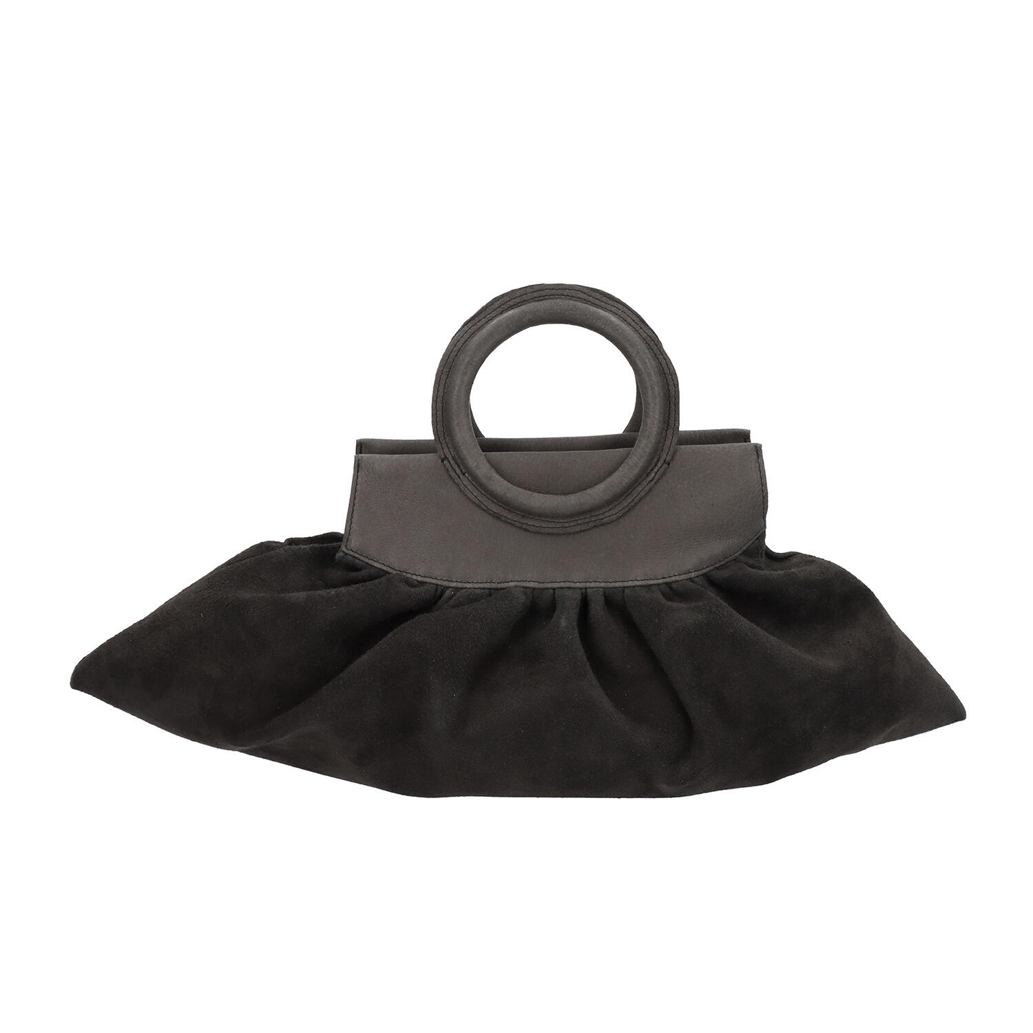 揺れるチャームにちなんで「ペンジュラム(振り子)」と名付けられたバッグ。柔らかいピッグスエードを使い、ギャザーを寄せてふんわりした個性的なシルエットに仕上げました。フラットな開口部には銀付き革(表革)を、またその下にはスエードを使い、質感の違いをデザインに活かしています。機能的なポケットも備えています。ファスナーなどの金具を使わず、シックな色味の丸ハンドルのバッグは、和装にも合いそうです。