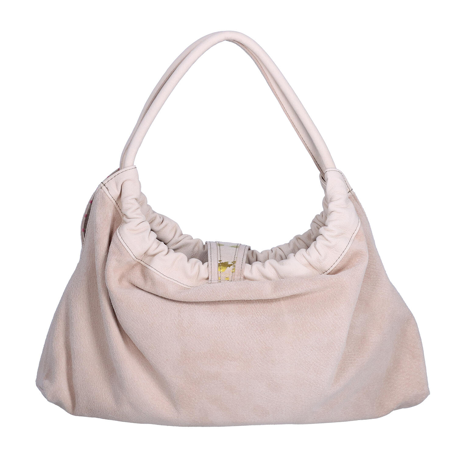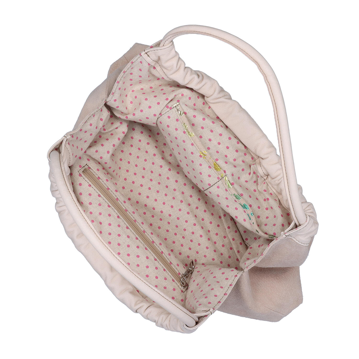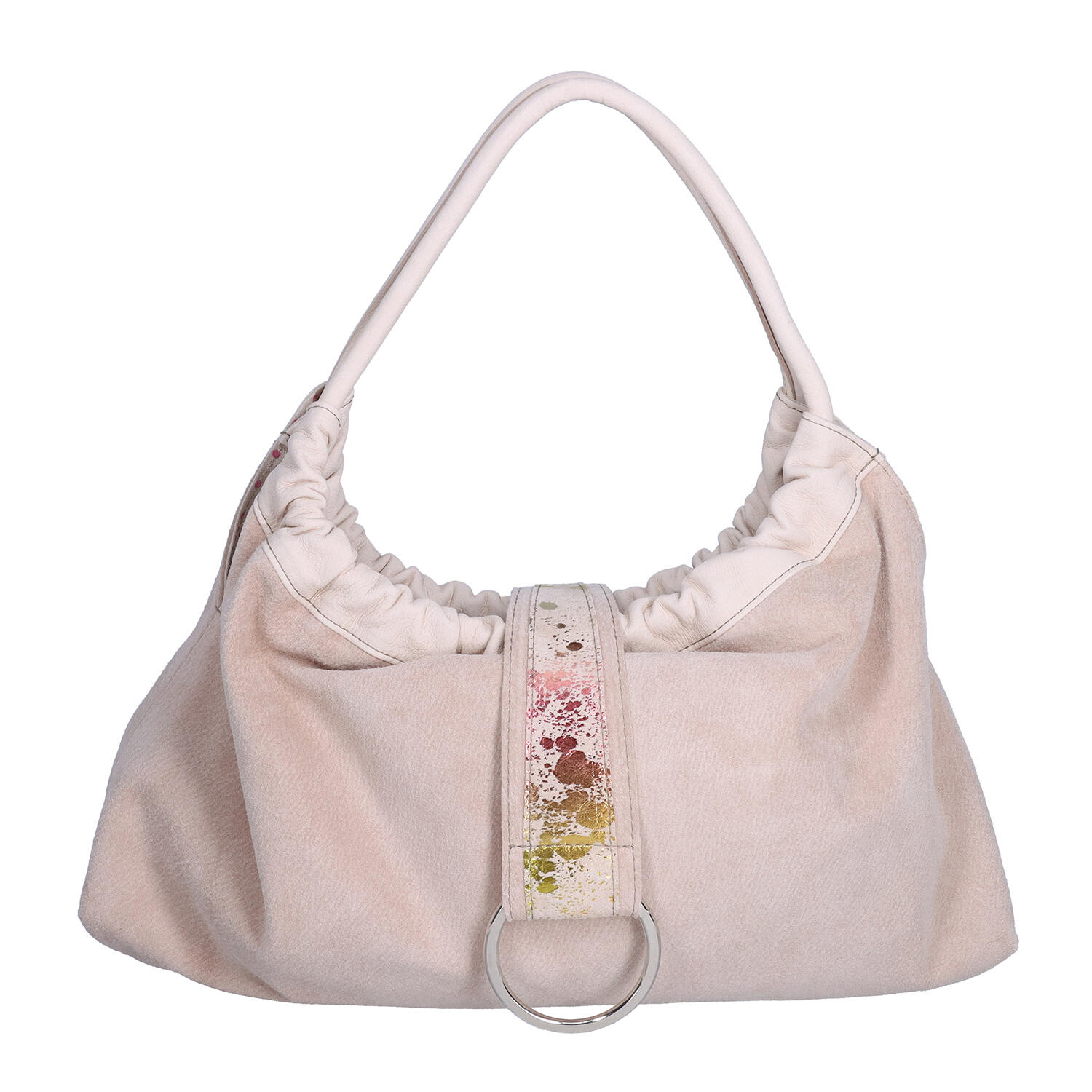 物を入れた時の自重がギャザーとシルエットを作るバッグ。ふんわりとした肌触りのピッグスエードは撥水加工が施されており、普段使いにも安心です。メベルトに付いているメタルのリングの重さで開口部を閉じるデザイン。箔加工したマルチカラーのベルトが、ピッグスエードとの色と質感のコントラストを作っています。サイドにはスリットを入れてあるため、肩にかけた時はしっかりしまっていても、物を出し入れする時は大きく開きます。内側には3つのポケットがあります。