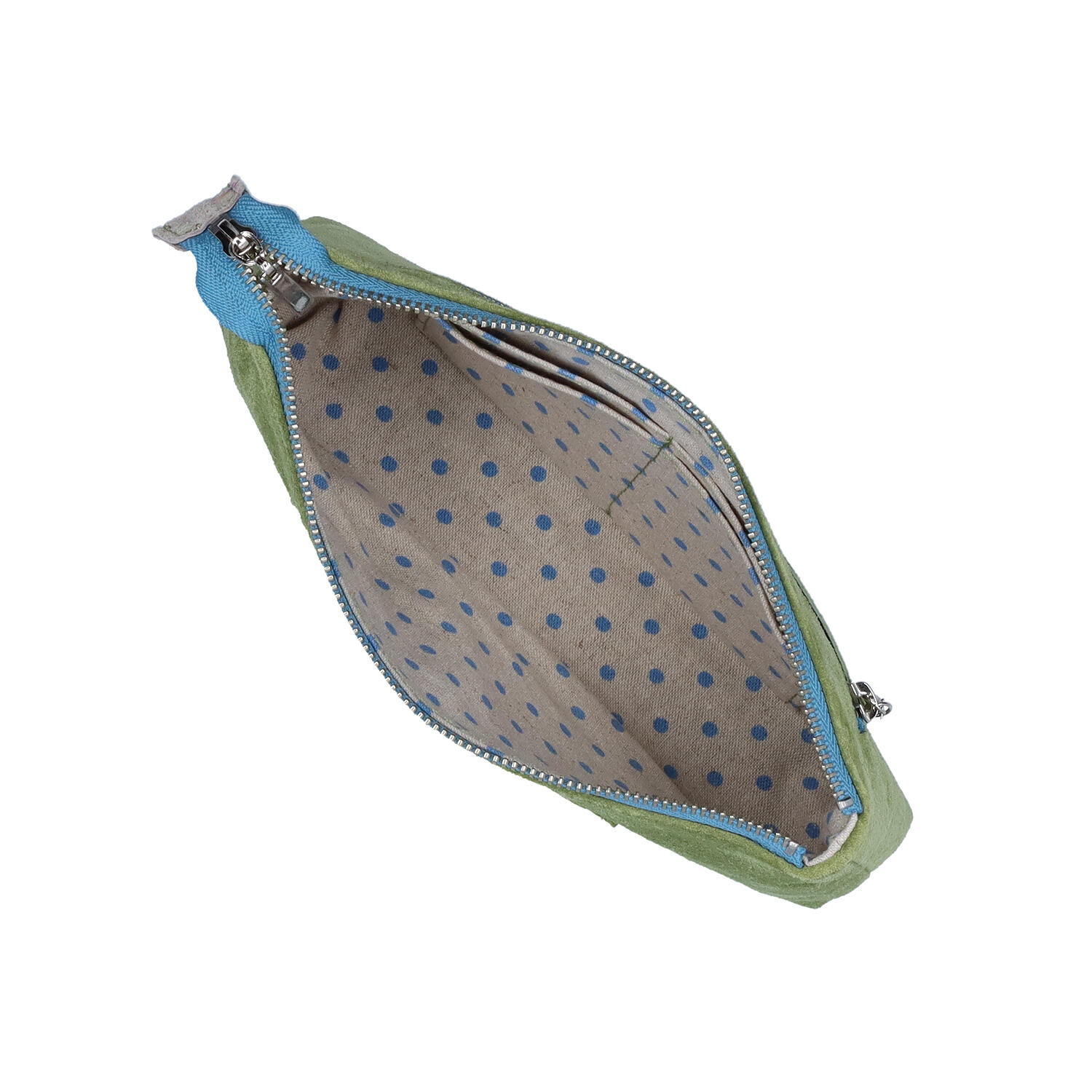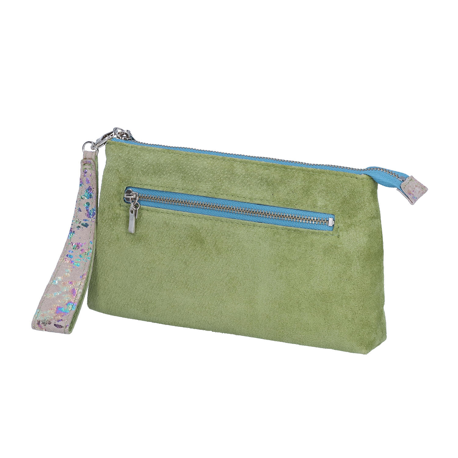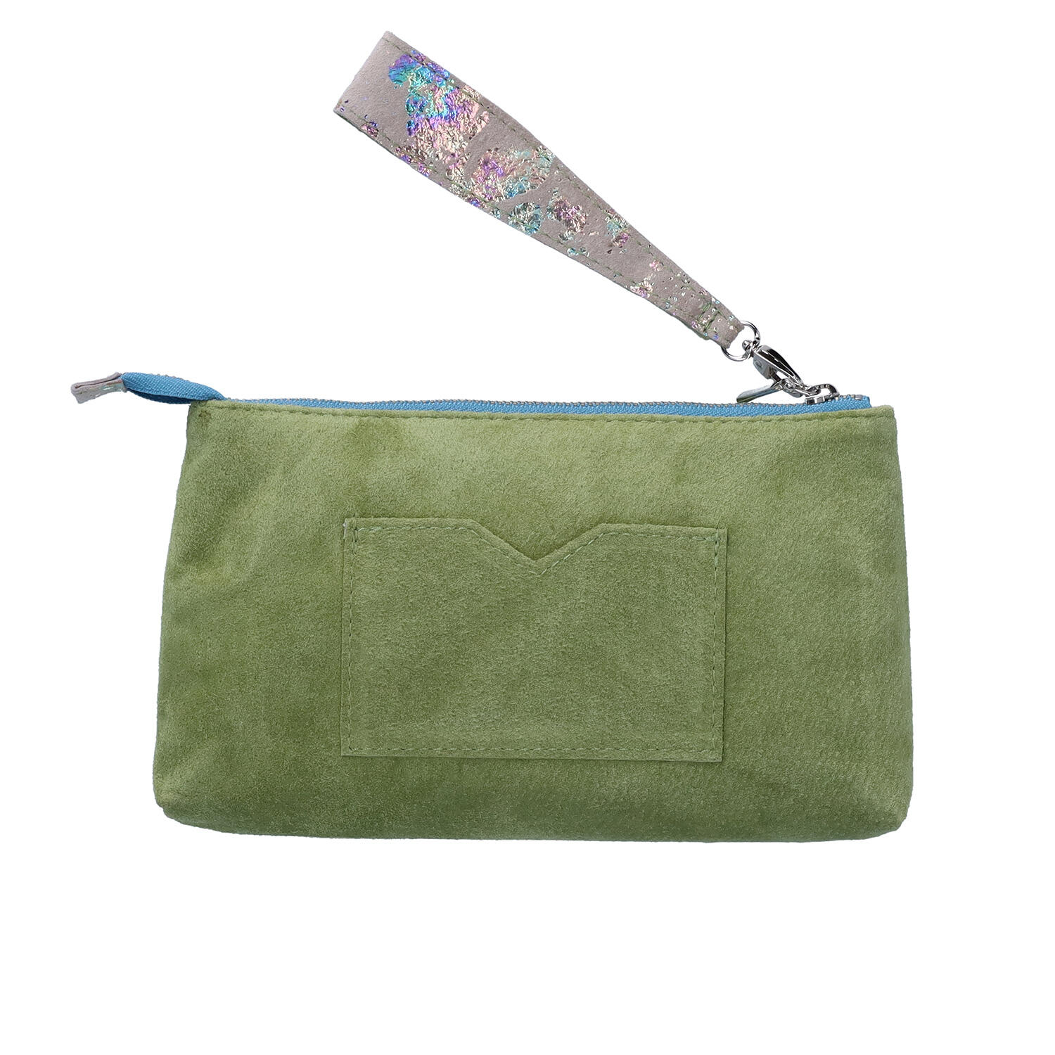 ピッグスキンのふんわりした手触りが、手に持った時に心地よい小さめのクラッチバッグ。「お薬手帳」や通帳を入れて大きすぎない大きさで、そのまま財布としてもお使いいただけるように、内側のポケットはカードサイズになっています。きらっと輝くマルチカラーのハンドストラップは着脱が可能。バッグに入れてポーチとして使う時は、取り外すことができます。