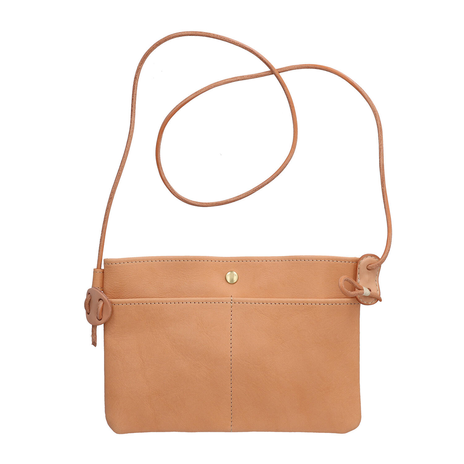 小さな財布やモバイルなど、必要最低限の荷物を持ち運べるマチなしのサコッシュです。本体だけでなく、紐や長さ調整のパーツにも革を使用し、統一感のあるデザインに仕上げました。文庫本やハンカチなどが収まるコンパクトなサイズで、ちょっとしたお出かけに便利です。スナップボタンがアクセントになっており、外ポケットにはモバイルを取り出しやすい縦型ポケットが2つ並んでいます。