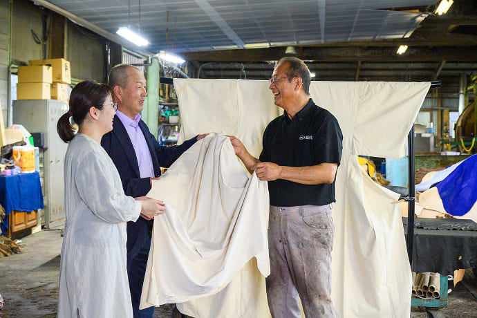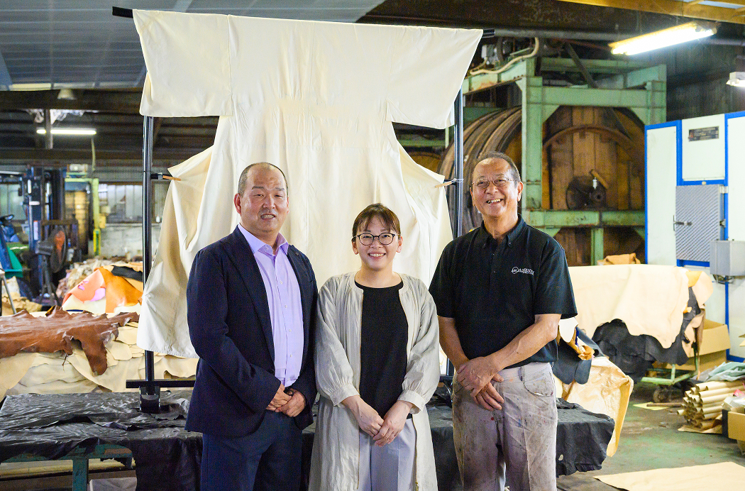 オールマイティのオリジナルレザーといえば、姫路発祥の白なめしを現代風にアレンジした「姫山水」と、カーフを使用したタンニンなめしの「渋山水」。今回は姫山水を使って着物の制作にチャレンジ。プロジェクトにかかわった株式会社オールマイティ(以下、オールマイティ)の水瀬隆行会長(以下、水瀬会長)、高田和裁の高田典浩さん(以下、高田さん)、2008年開催「第46回 技能五輪全国大会」和裁部門で優勝した高田和裁の縫子、高田早奈恵さん(以下、早奈恵さん)に話を聞いた。