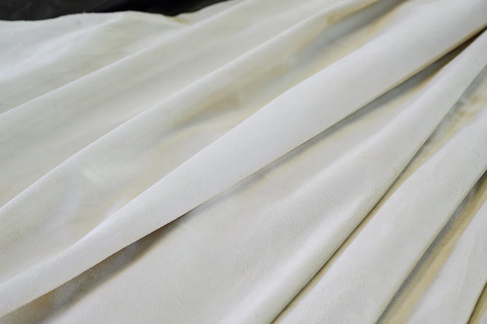いわゆる姫路の白なめしの系譜を受け継ぐ革です。伝統的な白なめし革は塩と菜種油でつくっていますが、姫山水は昔みたいに天然油というわけやなしに、薬品用の油をメインに使っています。ちなみに、日本エコレザー認定(Japan Eco Leather=JEL)のゴールドを取得しています。