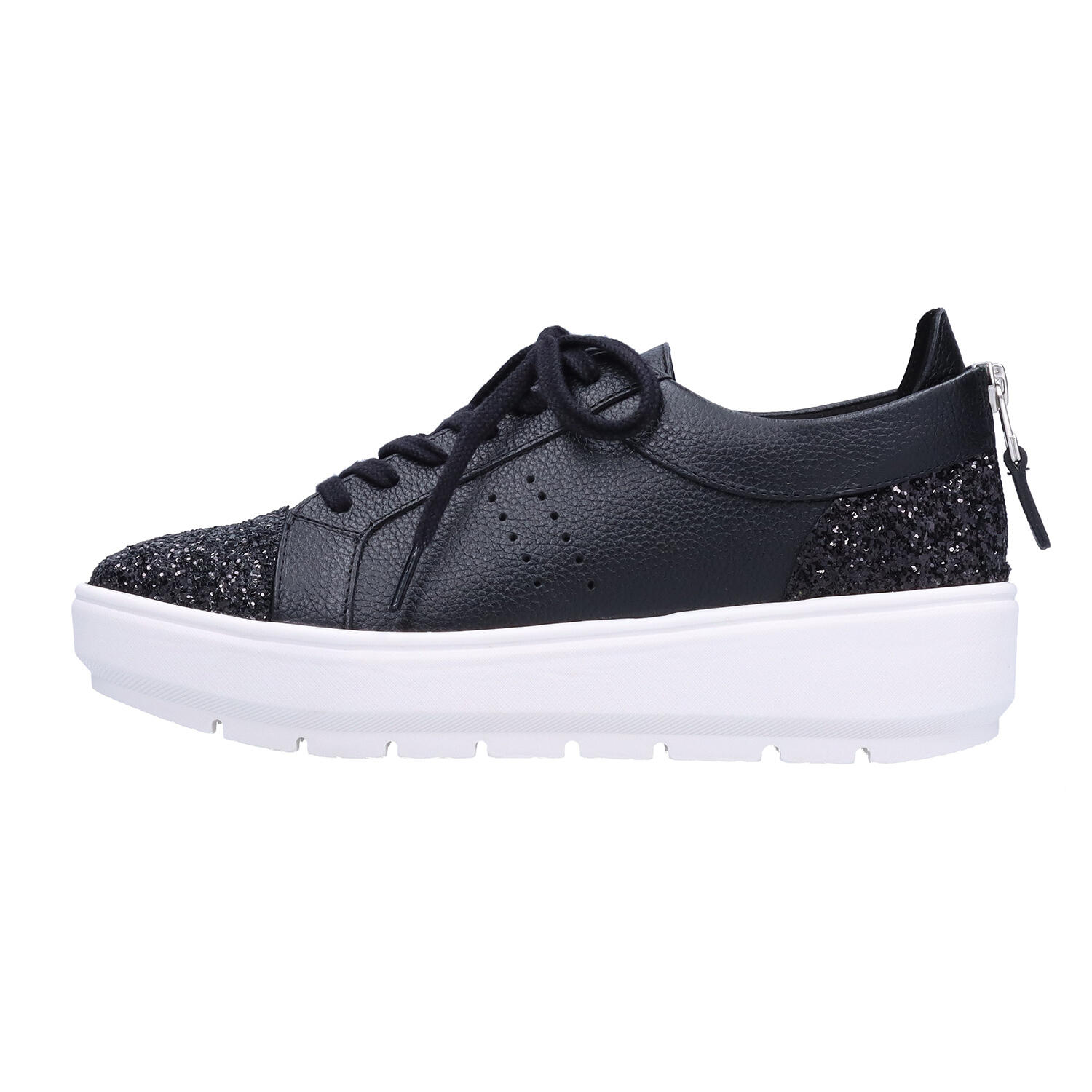 爪先と踵部分にグリッターをあしらった、きらっと光るレザースニーカー。フィット感を調整できるレースアップタイプですが、踵のファスナーで着脱も簡単です。軽くてクッション性も高いEVA素材をアウトソールに使用。表情はスニーカーですがヒール高は5㎝。1.5㎝の傾斜があり、足長効果も得られます。