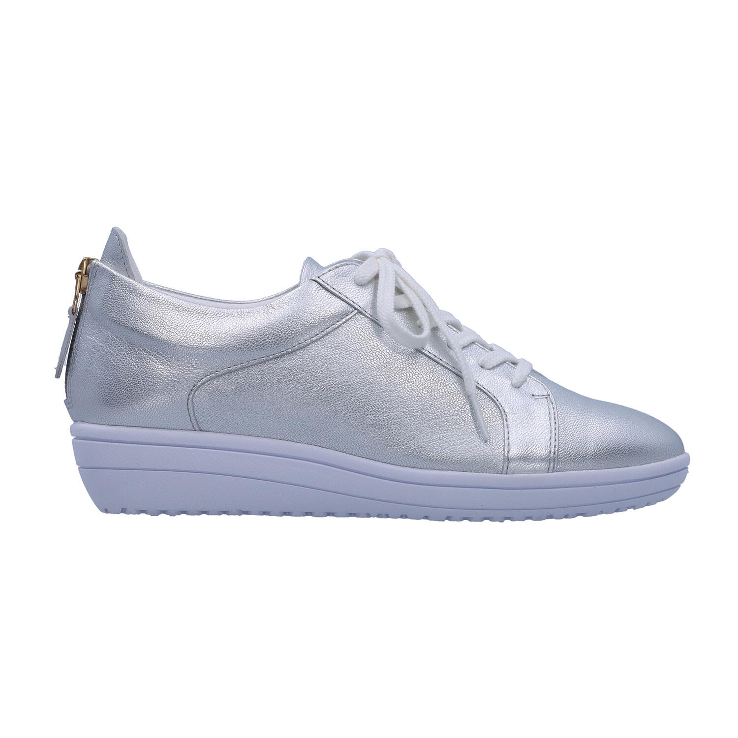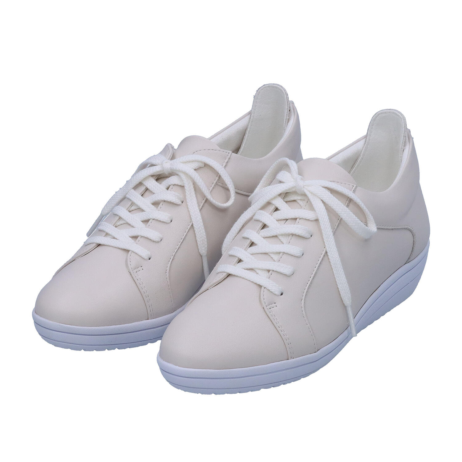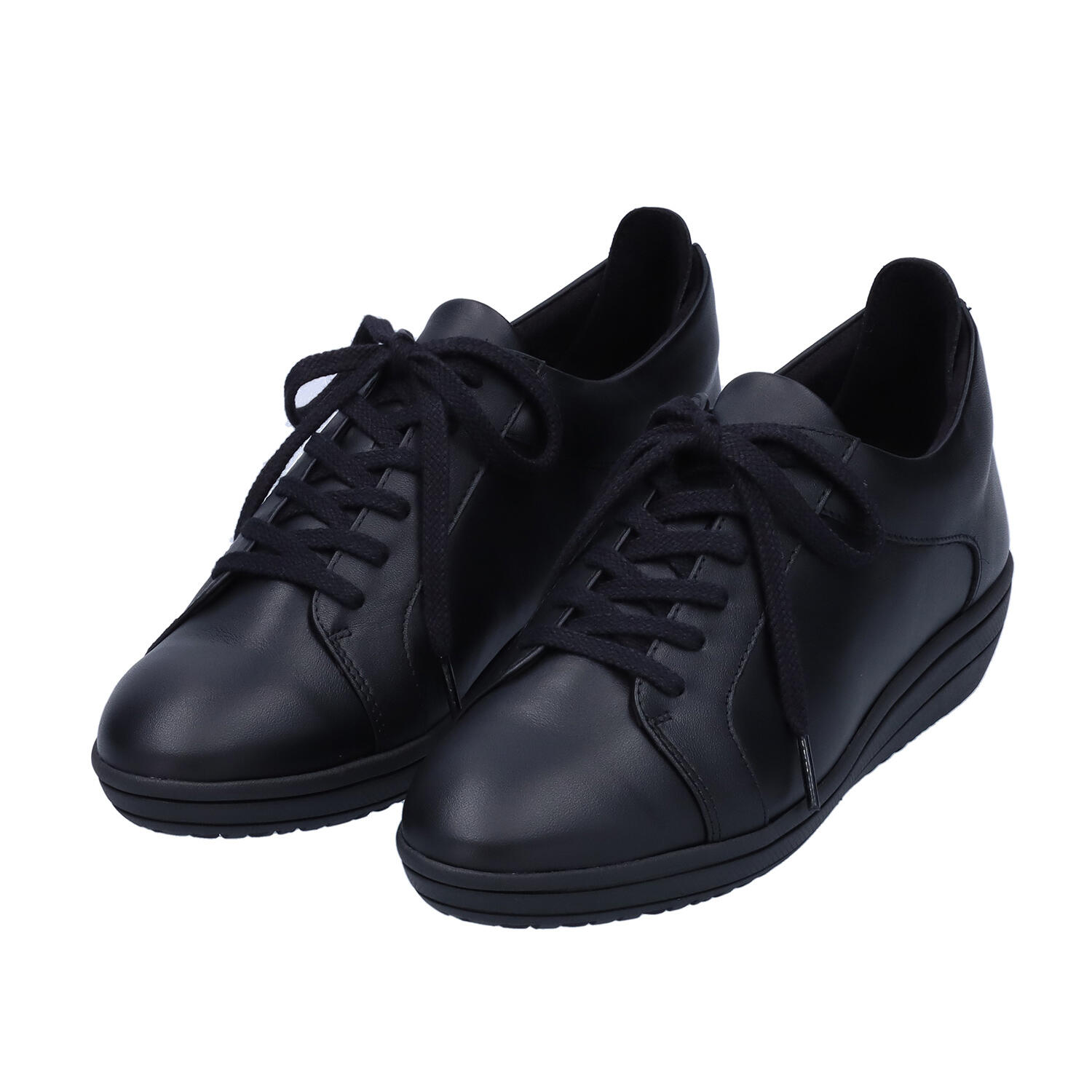 ソールとアッパーをなだらかな曲線でつなげ、すっきりとしたフォルムに仕上げたレザースニーカー。アッパーの素材は肌理(きめ)細かく上品な印象のシープレザー。アウトソールは軽くてクッション性も高く、寒くなっても固くなりにくい「EVA」素材を使っています。かかとのファスナーで着脱も簡単です。