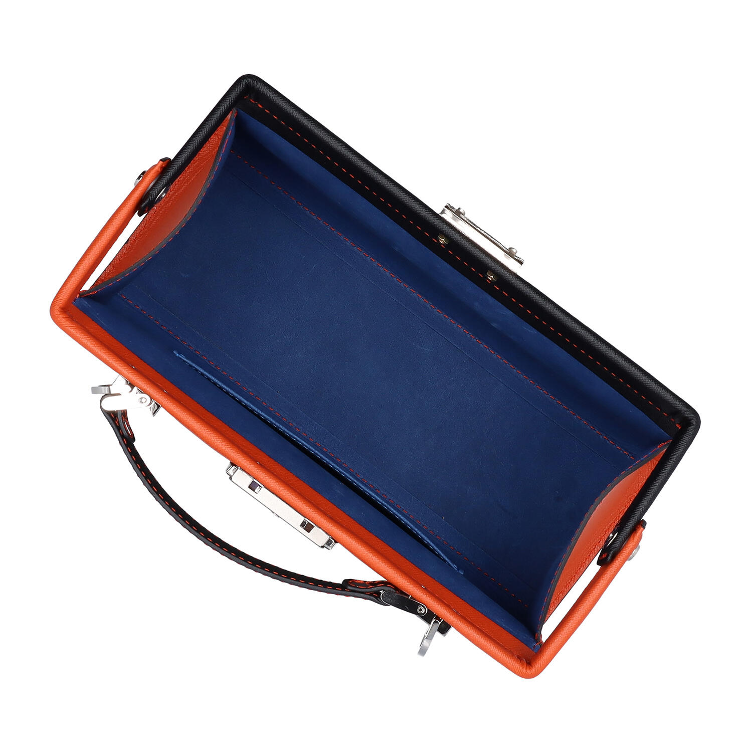 文庫本を入れられる小さめのサイズ、台形がかわいい2Wayバッグです。バイカラー使いで、単色のものより少しスポーティな印象。取り外しできるショルダーストラップ付きで、斜め掛けにすることができます。大きく開き、中が見やすいドクターバッグ型の開口部はワンタッチで開閉できるシステム。片手で楽に開け閉めができるところも魅力です。外側の革は、特殊な脂分を繊維にまで浸透させた耐水性のある牛革「プリズムレザー」を使用。革の風合いを維持し、水分による色落ちや劣化が生じにくいのが特徴です。内装には、美しい色で肌触りのよい牛革ヌバックを使っています。