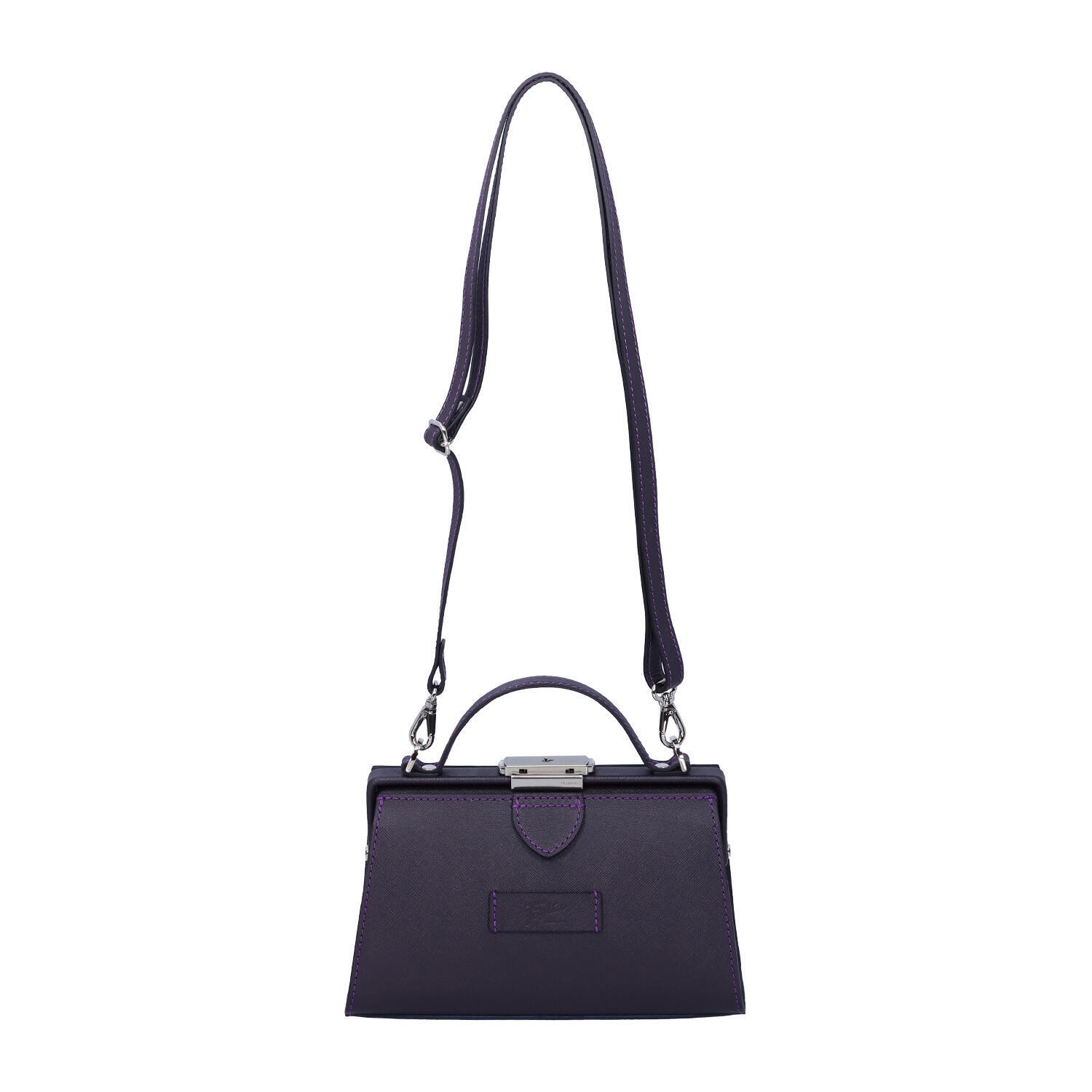長財布が無理なく入る幅を確保した、台形がかわいい2Wayバッグです。取り外しできるショルダーストラップ付きで、斜め掛けにすることができます。大きく開き、中が見やすいドクターバッグ型の開口部はワンタッチで開閉できるシステム。片手で楽に開け閉めができるところも魅力です。外側の革は、特殊な脂分を繊維にまで浸透させた耐水性のある牛革「プリズムレザー」を使用。革の風合いを維持し、水分による色落ちや劣化が生じにくいのが特徴です。内装には、美しい色で肌触りのよい牛革ヌバックを使っています。お揃いで使っていただける財布もあります。
