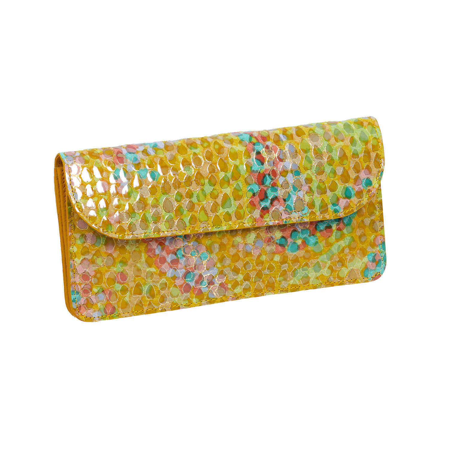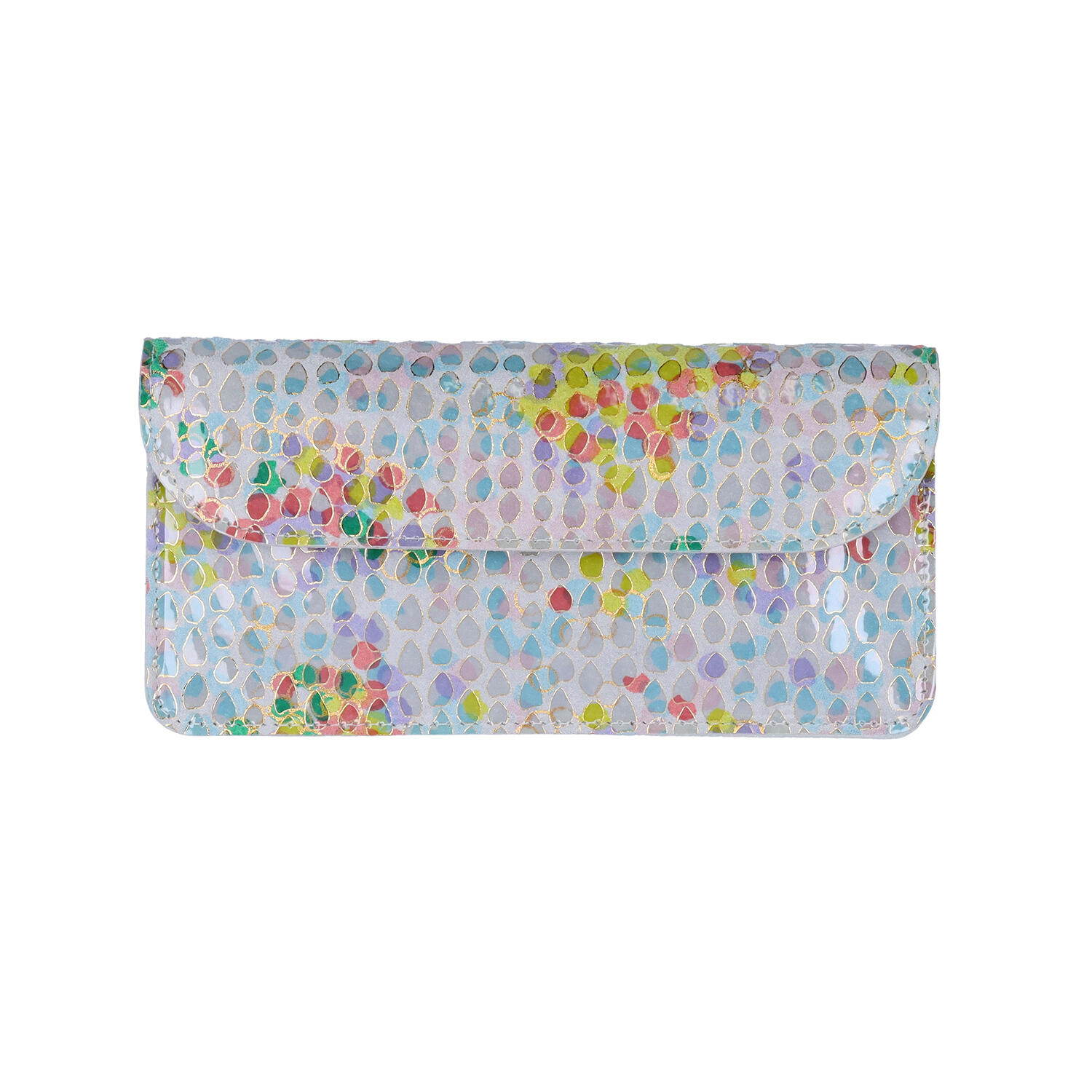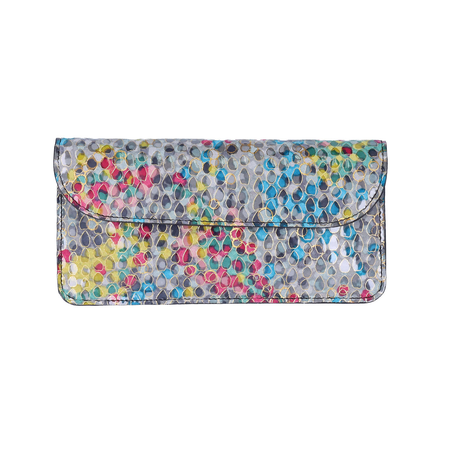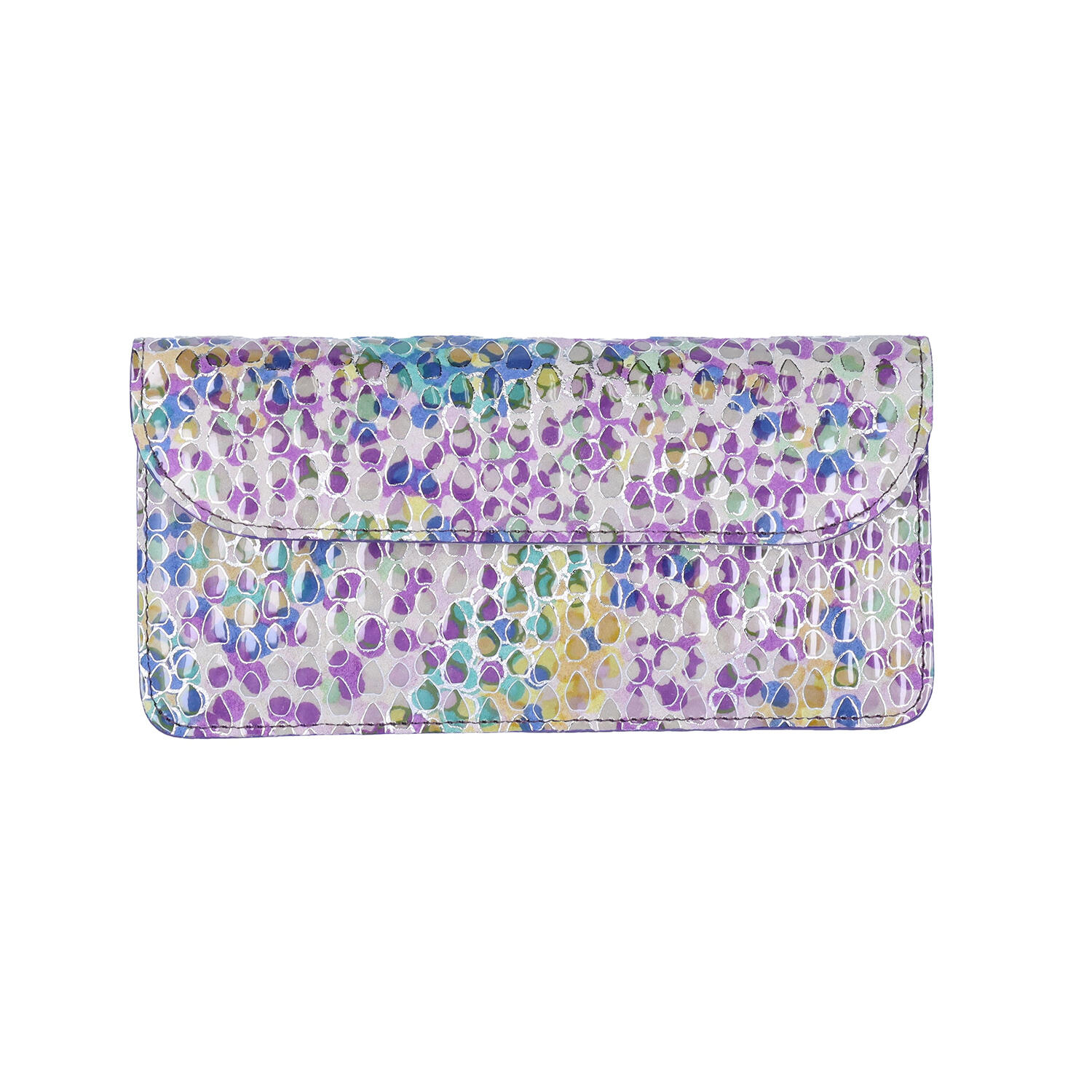 伝統工芸などでも使われる「手捺染(てなせん)」(シルクスクリーンプリントの一種)で鮮やかに染められたピッグスキン。そこに雫型のエナメル樹脂を染み込ませた素材を使いました。点描画のような美しい色柄で、手にする度に明るい気分になれる長財布です。一般的なカードの大きさより少し大きなカードポケットは、診察券などを入れるのにも適しています。フリーポケットも充実しています。