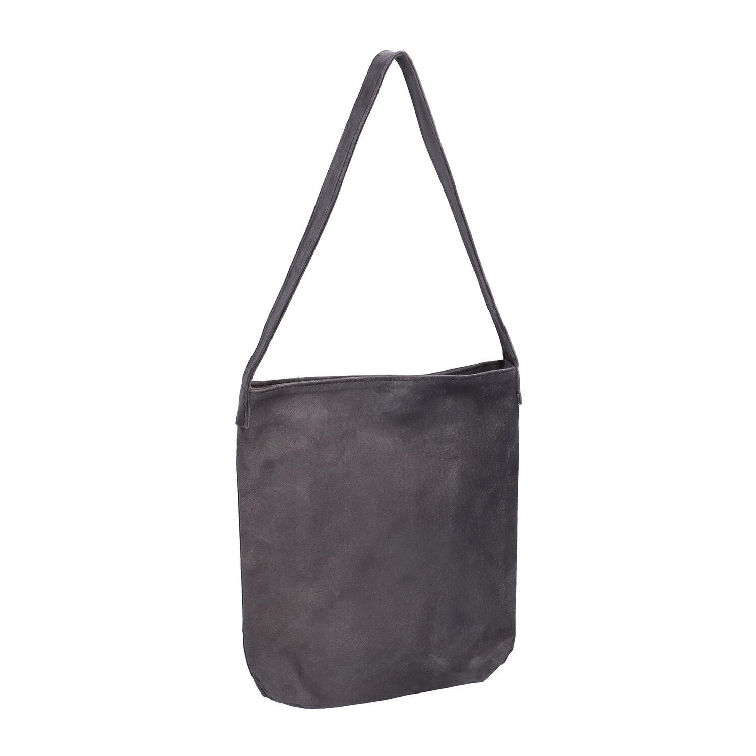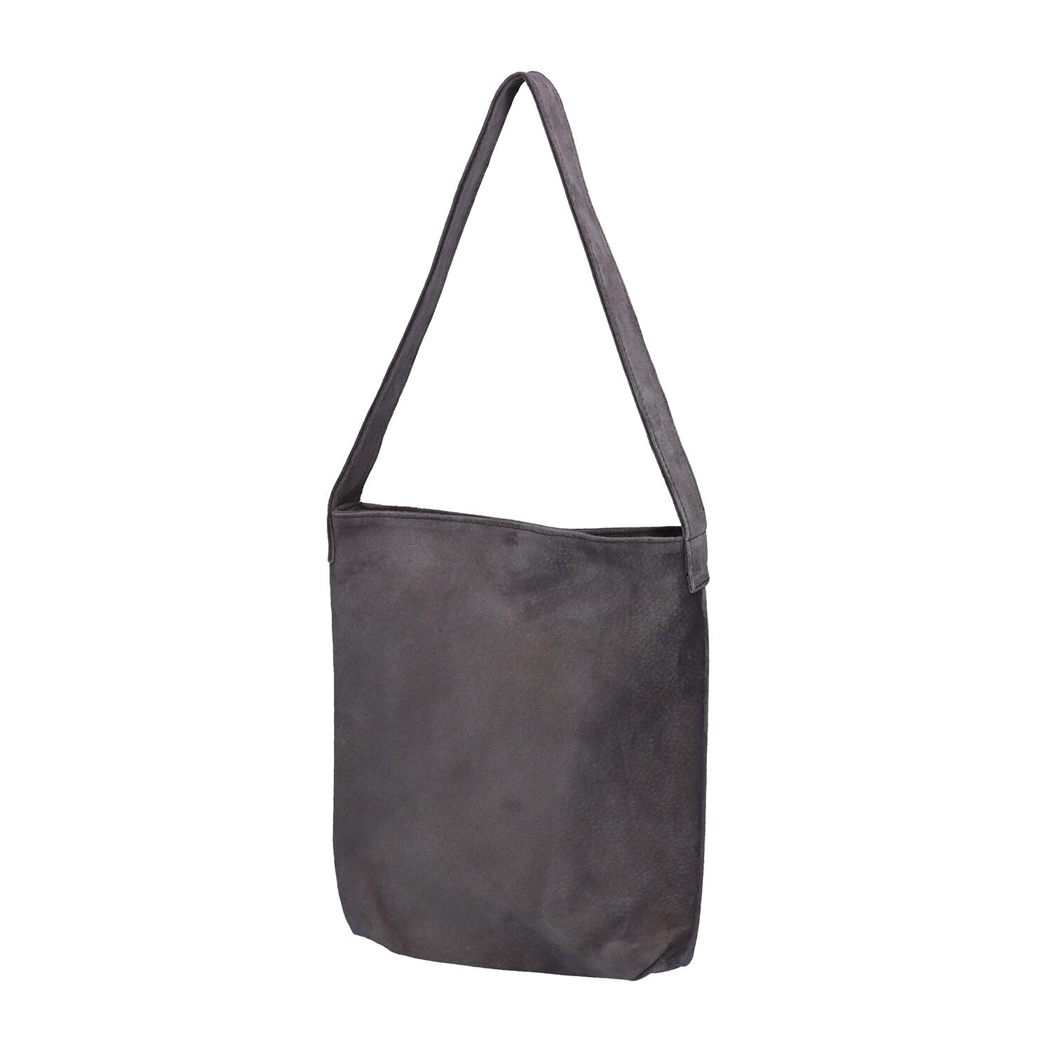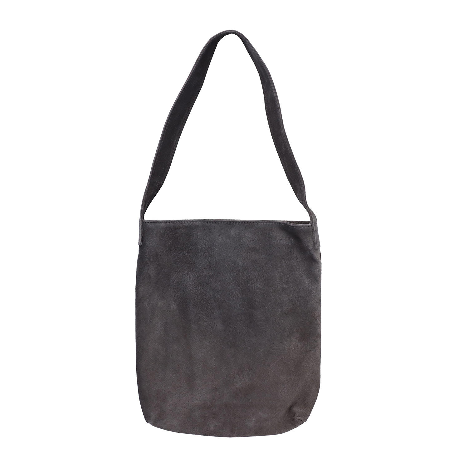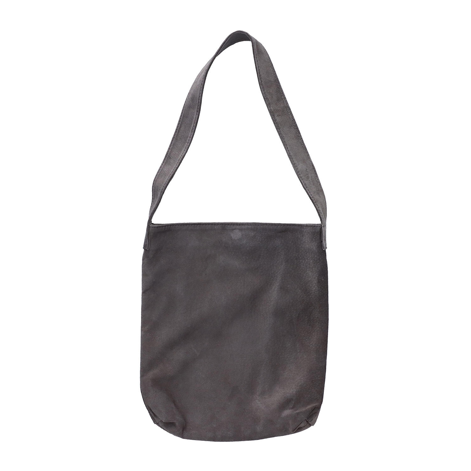 長方形にショルダーストラップを付けた、シンプルな縦型サコッシュ。特殊な油と染料を使ってなめしと染めを施し「手洗いができる革」として仕上げたピッグスエードを使っています。厚手のアウターを着ても肩にかけることができるストラップの長さ、手が入れやすく深すぎない縦横バランスは、肩にかけても手に持ってもよいサイズ感です。