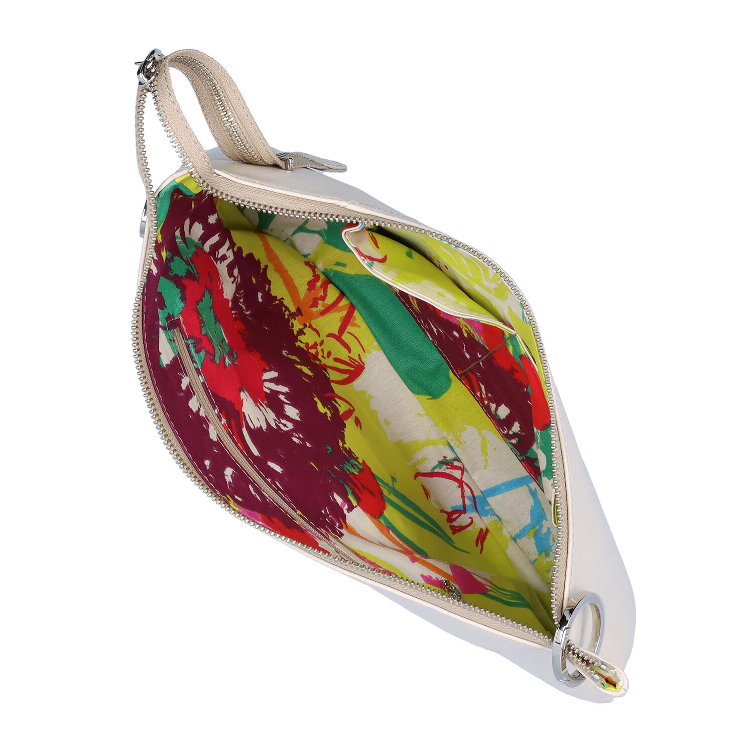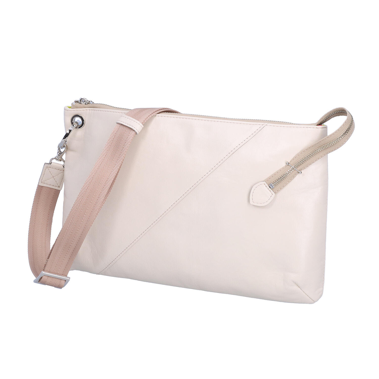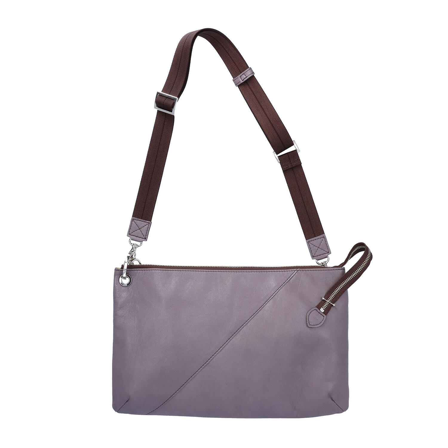 クラッチバッグ、クロスボディ(斜めがけ)、ショルダーバッグなど、ストラップの調整と取り外しで色々なスタイルで使うことできる薄マチのバッグ。ショルダーストラップは革ではなくあえて織柄の入ったナイロンテープを使用することで、上品ながらスポーティな要素を取り入れました。斜めに入った切り替えや、大きく伸びたファスナーテープが気取らない遊び心をプラス。背面のファスナーはレザーで覆い、ウェアを傷つけない配慮がなされています。