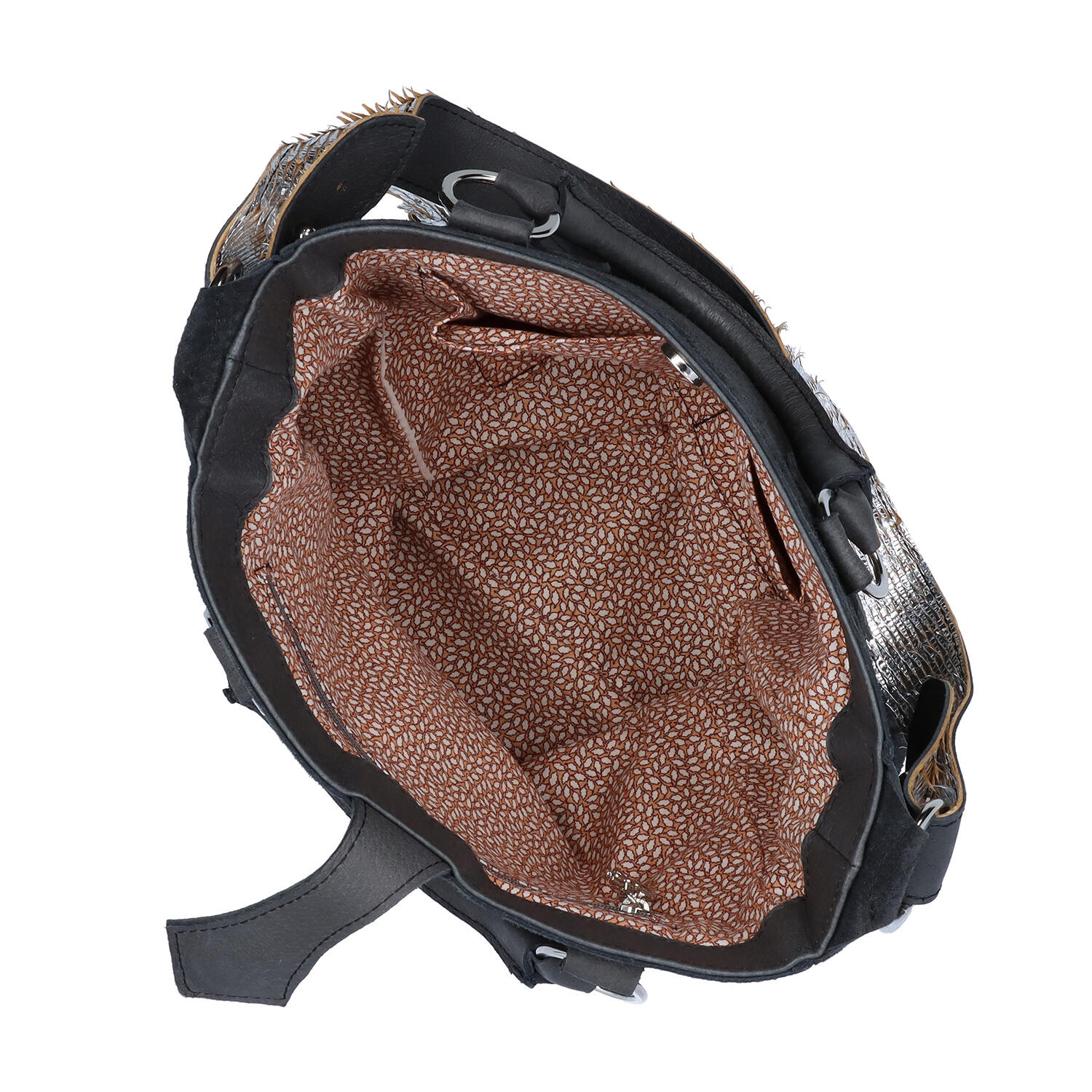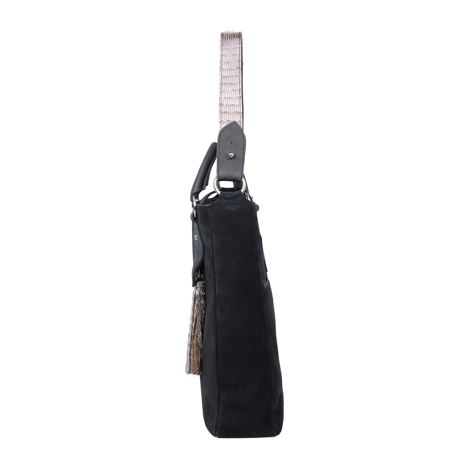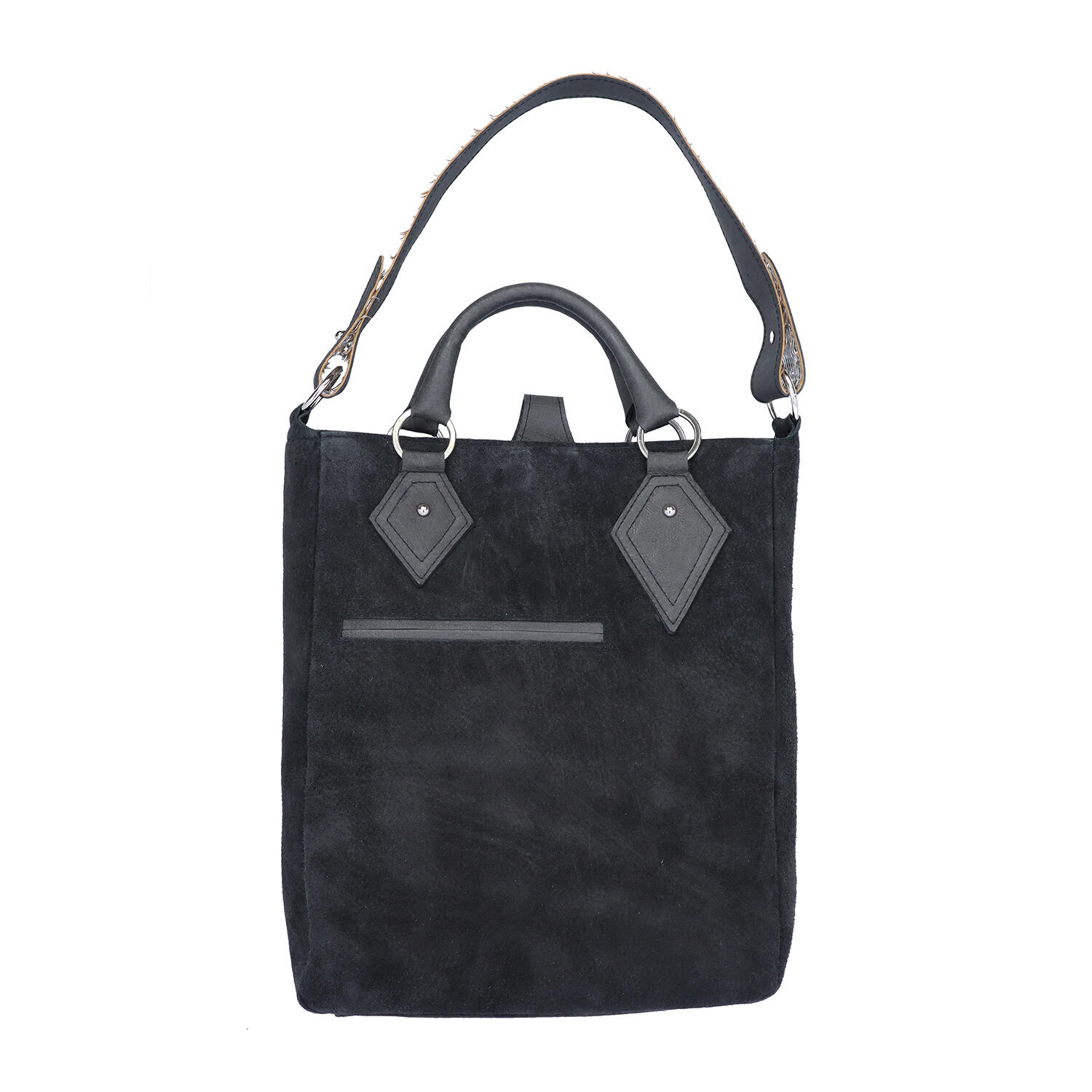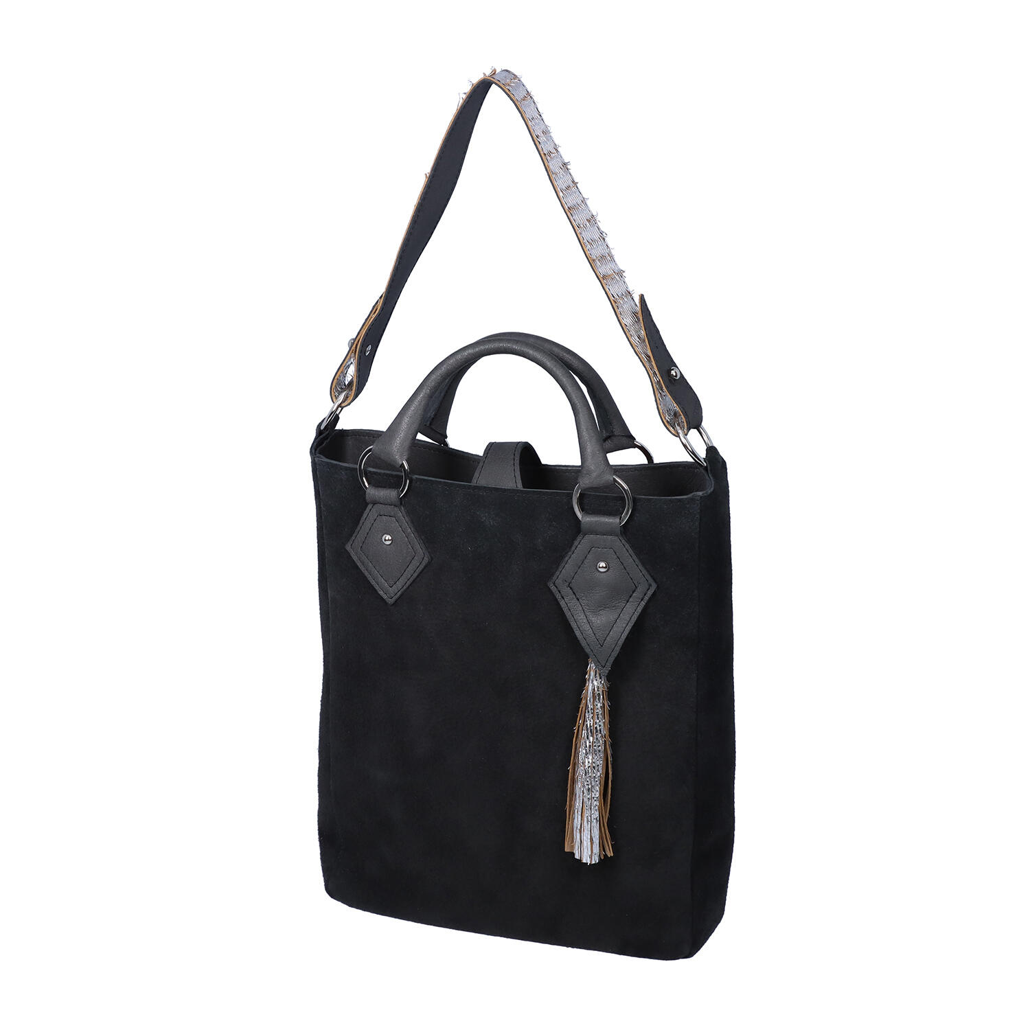 A4ファイルが入る大きさの、ショルダーストラップ付きトート。ダークカラーの縦型仕様のため、荷物が多くてもすっきり見えます。柔らかなピッグスエードと、ハンドルやその他のパーツで使われている表革とのコントラストに加え、特殊加工を施したメタリックカラーの3つの質感の違いは、手触りと経年変化が楽しみになります。アシンメトリーなダイヤ型パーツの下のタッセルは、着脱が可能。きらきらと光るショルダーストラップと共に、トートバッグの印象を大きく変えることができます。5つの底鋲が汚れと型崩れを防ぎます。