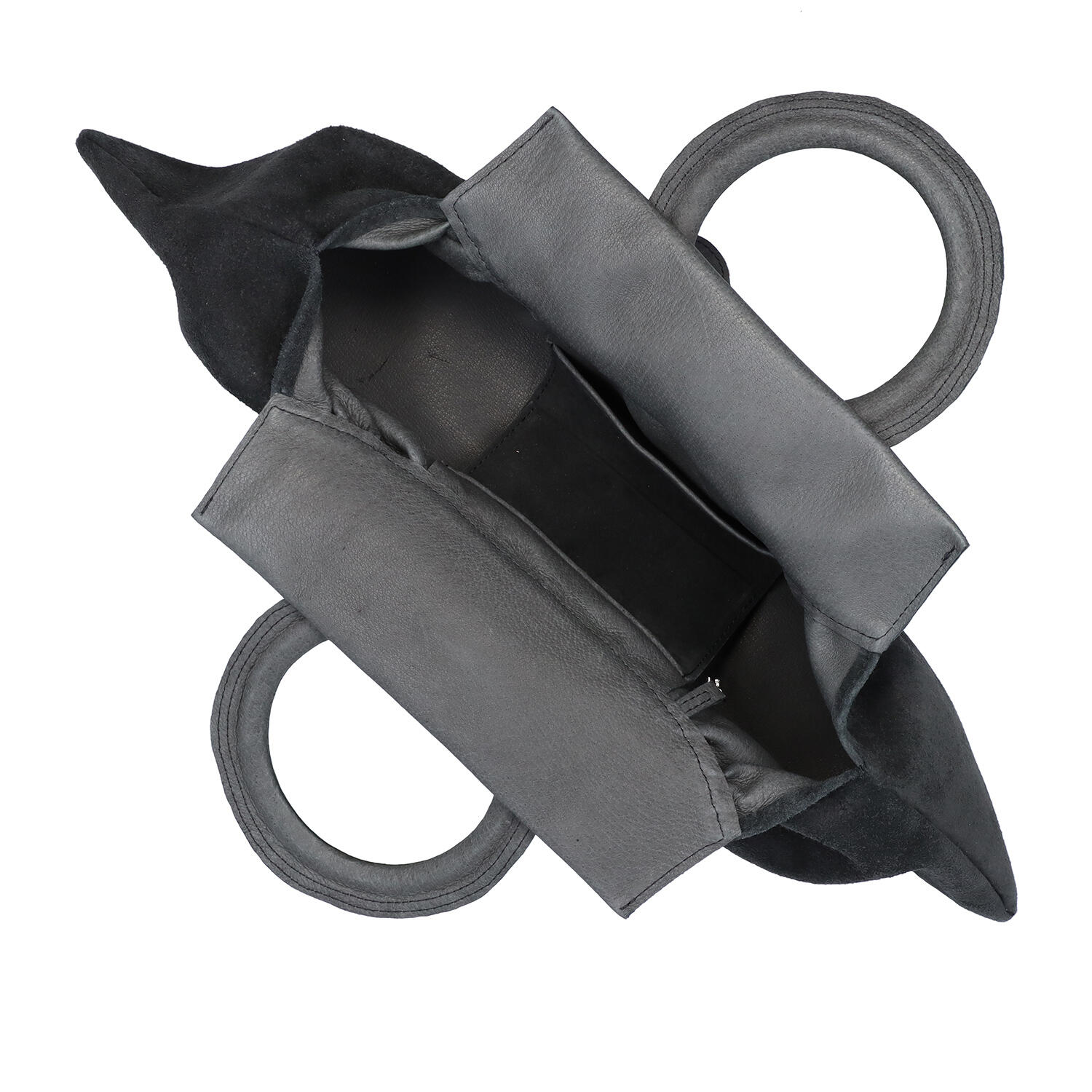 揺れるチャームにちなんで「ペンジュラム(振り子)」と名付けられたバッグ。柔らかいピッグスエードを使い、ギャザーを寄せてふんわりした個性的なシルエットに仕上げました。フラットな開口部には銀付き革(表革)を、またその下にはスエードを使い、質感の違いをデザインに活かしています。機能的なポケットも備えています。ファスナーなどの金具を使わず、シックな色味の丸ハンドルのバッグは、和装にも合いそうです。