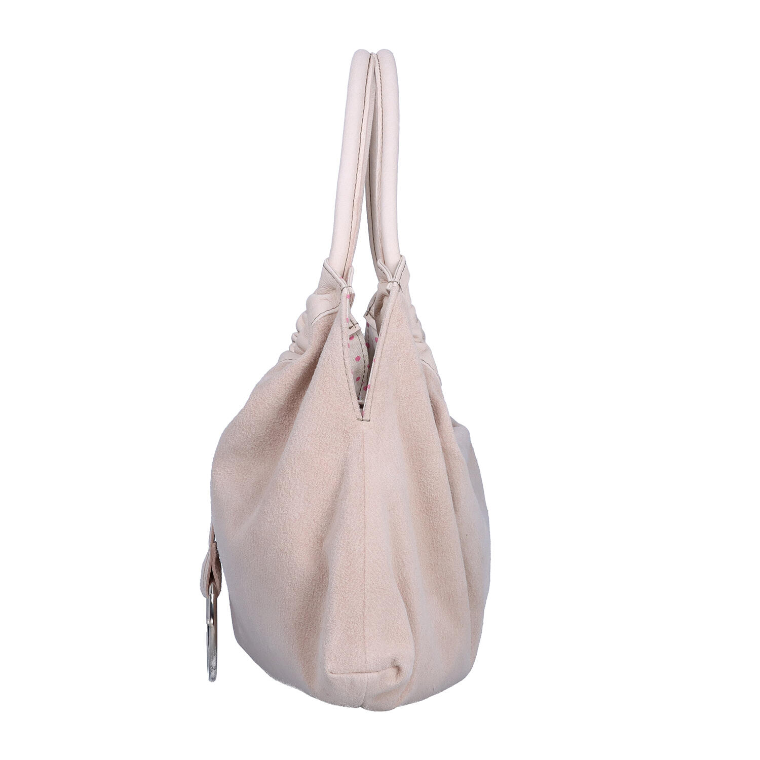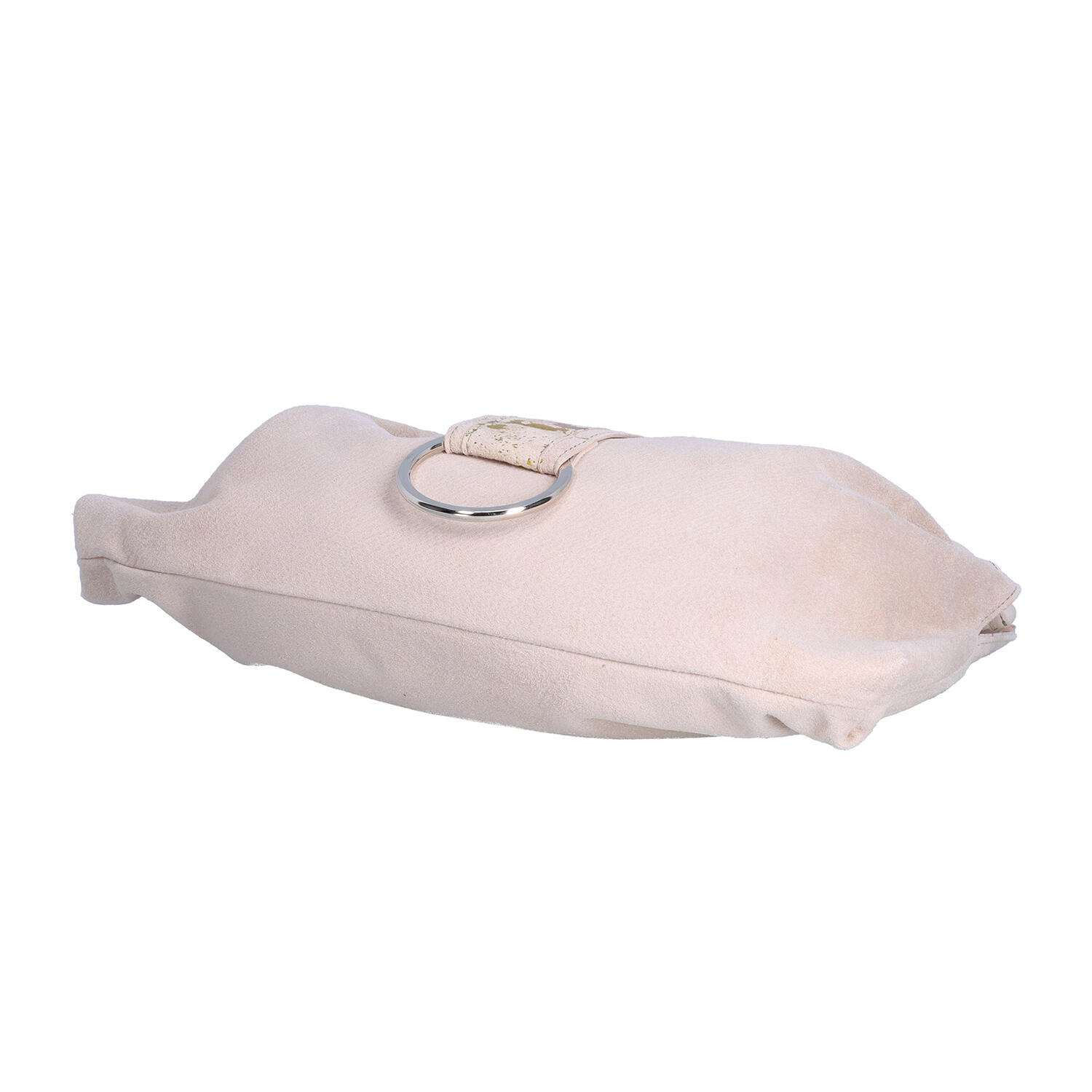 物を入れた時の自重がギャザーとシルエットを作るバッグ。ふんわりとした肌触りのピッグスエードは撥水加工が施されており、普段使いにも安心です。メベルトに付いているメタルのリングの重さで開口部を閉じるデザイン。箔加工したマルチカラーのベルトが、ピッグスエードとの色と質感のコントラストを作っています。サイドにはスリットを入れてあるため、肩にかけた時はしっかりしまっていても、物を出し入れする時は大きく開きます。内側には3つのポケットがあります。