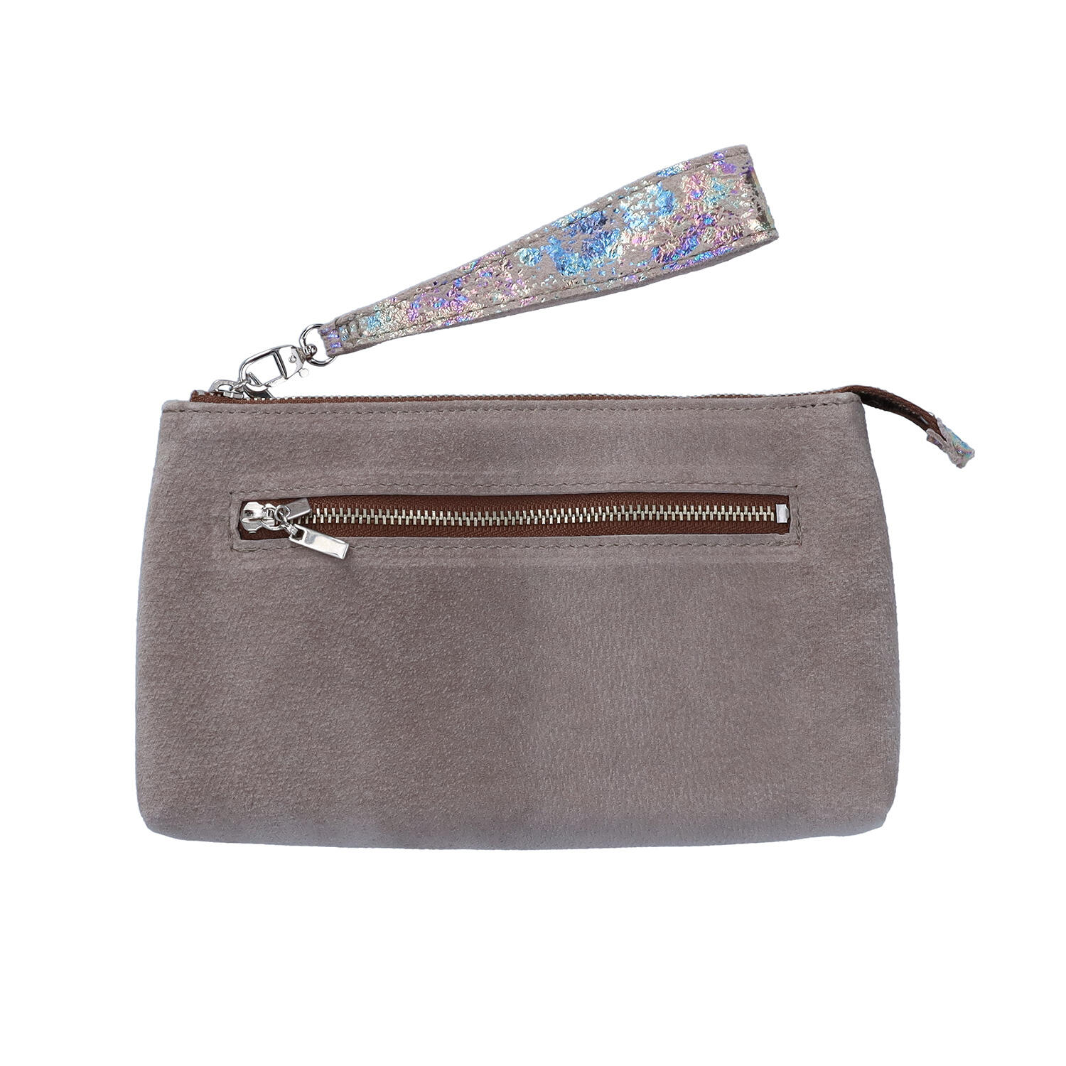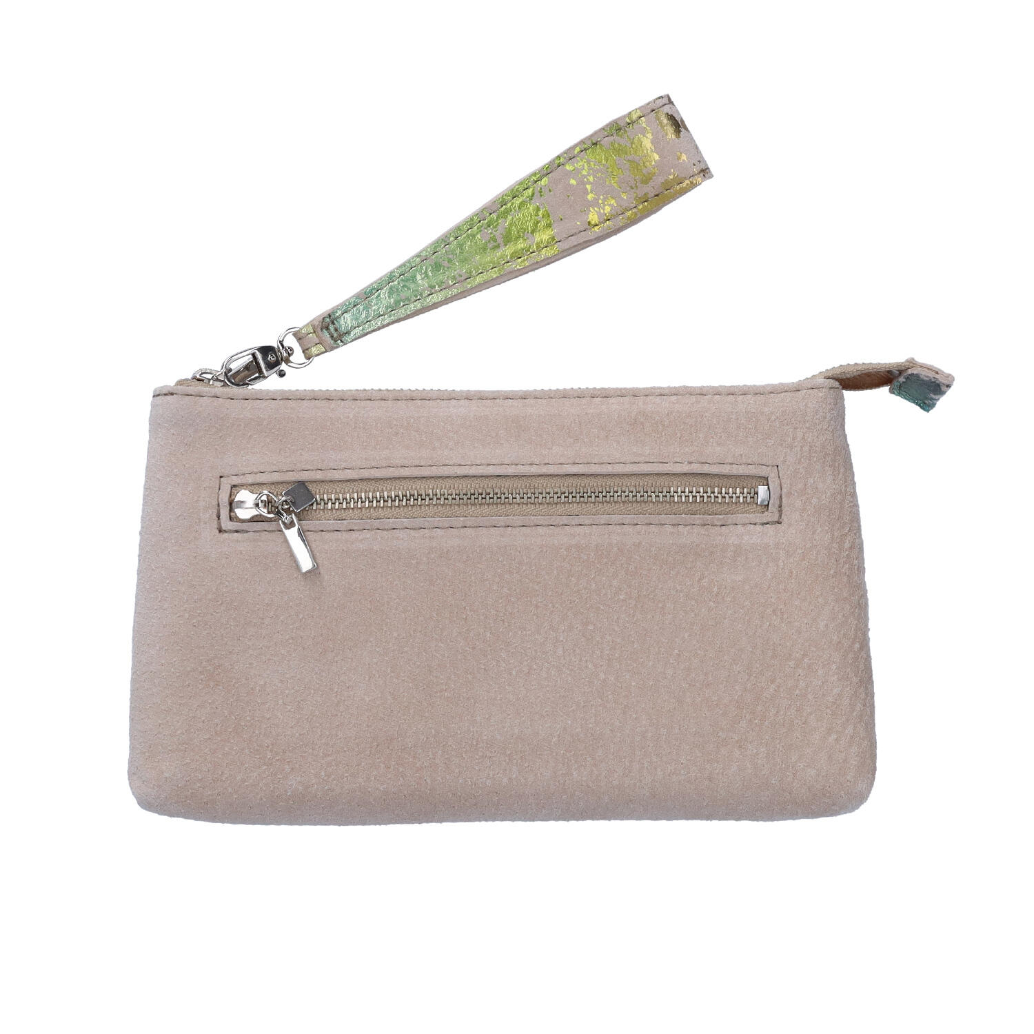 ピッグスキンのふんわりした手触りが、手に持った時に心地よい小さめのクラッチバッグ。「お薬手帳」や通帳を入れて大きすぎない大きさで、そのまま財布としてもお使いいただけるように、内側のポケットはカードサイズになっています。きらっと輝くマルチカラーのハンドストラップは着脱が可能。バッグに入れてポーチとして使う時は、取り外すことができます。
